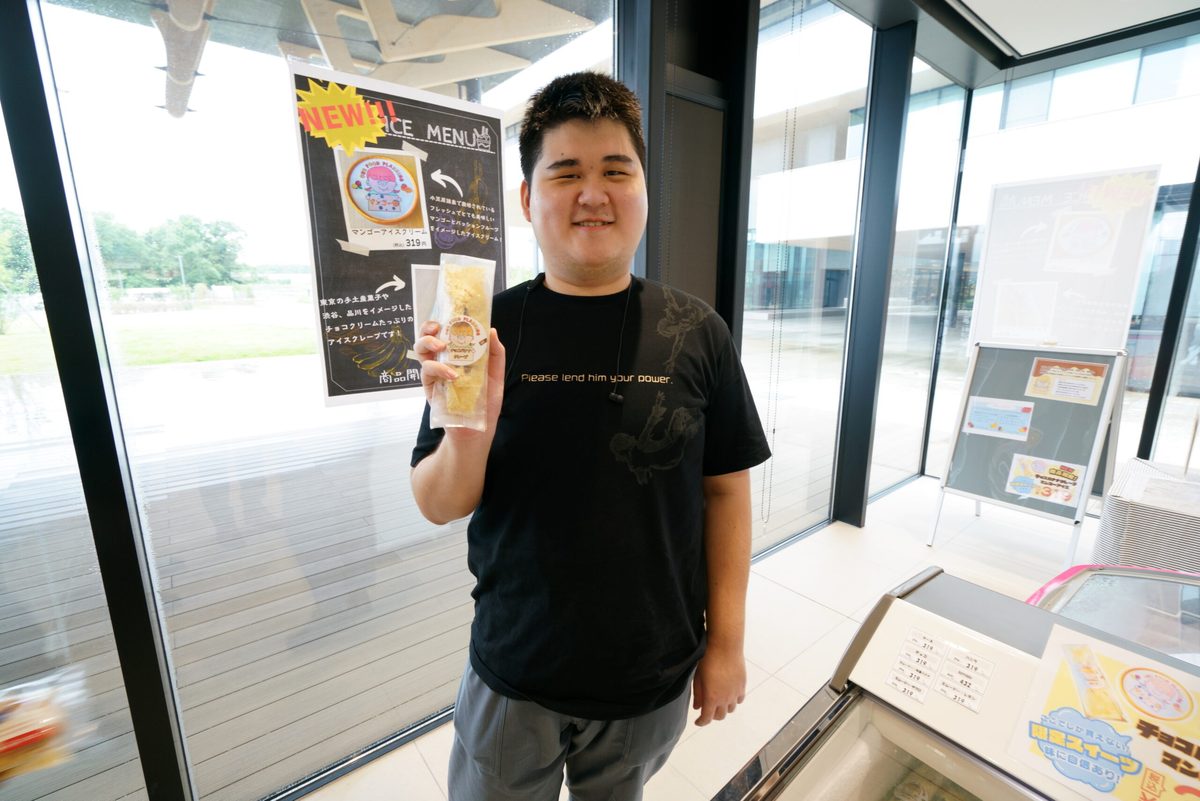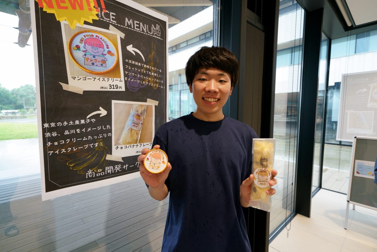 熊本キャンパスと阿蘇くまもと臨空キャンパスで活動する商品開発サークルが、7月から両キャンパスの売店で、アイスクリーム専門工房ついんスター(熊本県菊池市)と協同開発した「マンゴーアイスクリーム」と「チョコバナナクレープ」の2種類のアイスクリームを販売しています。