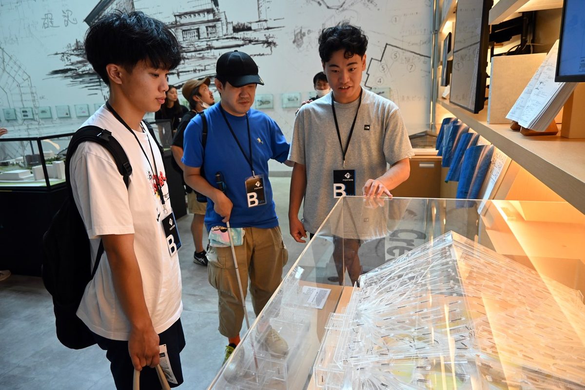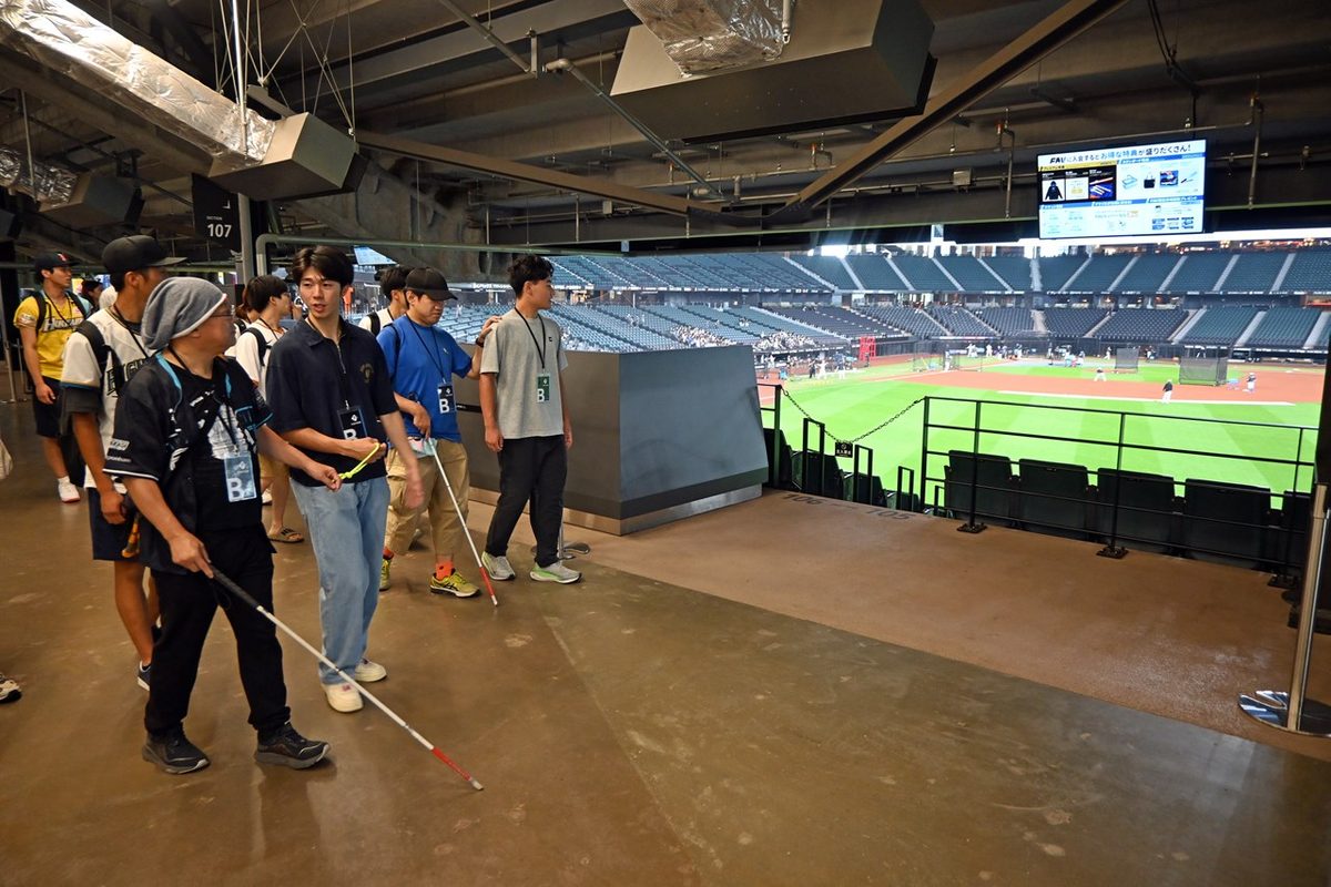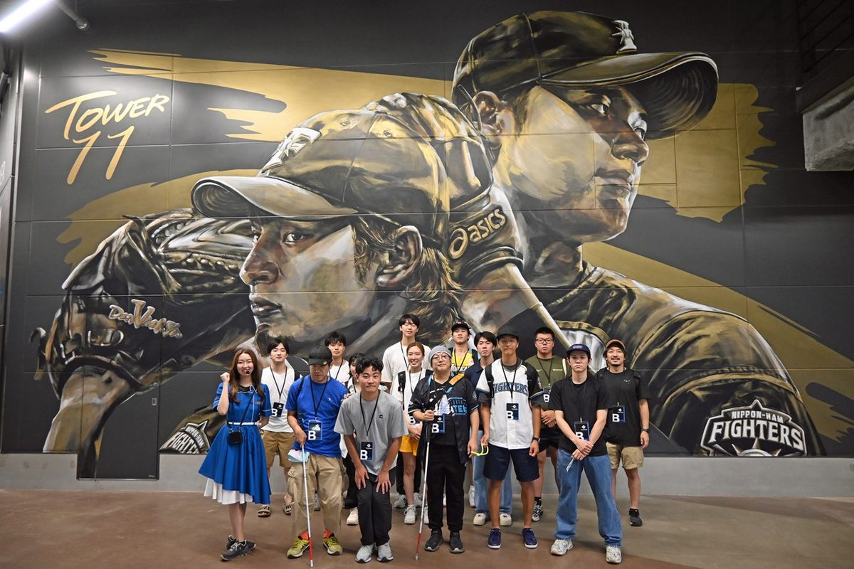 また同日には、国際文化学部地域創造学科の植田俊准教授が担当する授業「地域創造フィールドワークC」の演習も実施。受講する11名の学生が視覚に障がいがあっても楽しめるスポーツ観戦の方法を探求しました。北広島市を拠点に活動する視覚障がい者団体「めねっと北広島」の協力を得て、事前に視覚障がい者による講演の聴講やエスコンフィールドの視察なども行いました。当日はスタジアムツアーに参加し、試合を観戦。学生たちは、投手がボールを投げるタイミングなど試合の状況を解説するとともに、ネクストバッターズサークルやブルペンにいる選手の様子、監督の表情まで伝えていました。
