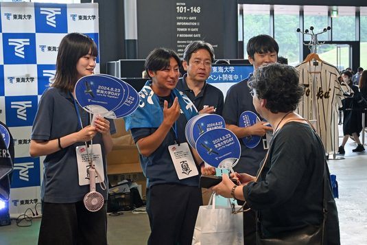 開場と同時に1塁外野側のコカ・コーラゲート近くに設置したプロモーションブースでは、札幌キャンパス硬式野球部のユニホームを着て写真が撮れる「フォトスポット」と、「東海大学と少しでも関わりがあったらプレゼントゲット!」の2つの企画を、国際文化学部と生物学部の学生有志ら9名が運営しました。学生たちは通りがかったファイターズファンの皆さんに「東海大学はご存知ですか?」「ファイターズの伏見寅威選手、今川優馬選手は東海大出身です!」と積極的に声をかけました。うちわやメガホンを手渡した中村立さん(国際文化学部地域創造学科3年次生)は、「少しでも多くの方に東海大学を知ってもらおうと声をかけ、たくさんのお客さまの笑顔が見られてよかった」と話していました。来場者からは、「湘南キャンパスの卒業生で現在は道内に在住しています。昨年は参加できなかったので、今年はぜひ行きたいと思っていました。道内でも有数の球場で、イベントを企画する学生の活躍を誇りに思います」といった声が聞かれました。