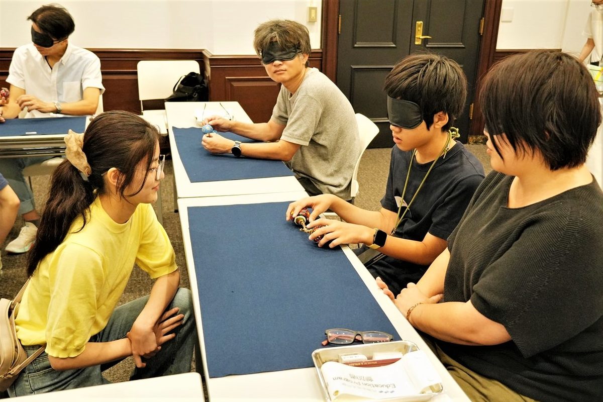 東海大学では8月10日に東京都・三井記念美術館で、「こども・ファミリープログラム 五感を研ぎ澄ます 鑑賞体験ワークショップ」を開催しました。このプログラムは、同美術館で開催されている展覧会「五感であじわう日本の美術」の関連イベント(こども・ファミリープログラム)として資格教育センターの篠原聰准教授が、三井記念美術館と共同で企画し講師を務めました。プログラムでは篠原准教授のほか、松前記念館の田中実紀さん(大学院文学研究科博士課程2年次生)、国立民族学博物館の広瀬浩二郎教授が特別講師を務め、松前記念館で「博物館実習2」を履修する学生4名が運営のサポートを行い、小中学生とその保護者約20名が参加しました。
