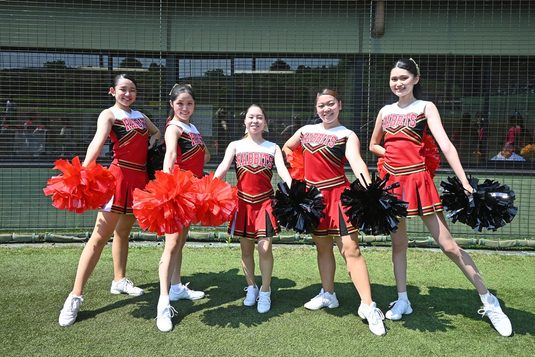 2022年度に入学した古橋るのさん(人文学部3年次生)らが1年時に、「清水や静岡キャンパスを盛り上げたい」という思いで「チアダンスサークル」を結成。建学祭や地域のイベントなどでパフォーマンスを披露するなど、活動の幅を広げてきました。今年4月には本学公認団体となり、「チアダンス部RABBITS」の名称で本格的な活動を始めています。今回のパフォーマンスは、静岡県内初のプロ球団として今年からウエスタン・リーグに参入したくふうハヤテの関係者に、古橋さんらが声をかけたことで実現しました。古橋さんは、「今年から公認団体になった私たちと、今年から結成されたくふうハヤテには共通点があると感じていました。日ごろ選手たちが清水を盛り上げてくれているので、今回は私たちが選手たちを応援して、地域を盛り上げようと思いました」と話します。