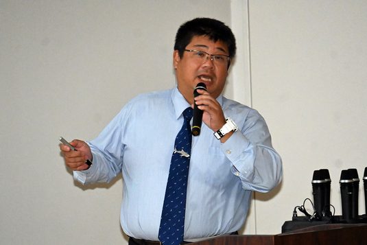 約160名が来場した当日は、冒頭で本学科の村山司教授(海洋科学博物館館長)があいさつし、シンポジウムの趣旨を説明しました。まず野原健司教授が登壇し、「大きな魚の小さな話~マグロゲノムを眺めてみたら~」と題して、日本人になじみの深いマグロの遺伝情報を生かした種類判別の方法について、種や産地の偽装防止に向けて取り組んでいる清水港での冷凍マグロ水揚げの現場での検査の様子を紹介。さらに、水揚げ現場ですぐに検査できる現場即応型検査システムの開発に向けた取り組みを解説し、「種の違いが分かれば、適正な流通や資源管理に貢献できる」と語りました。
