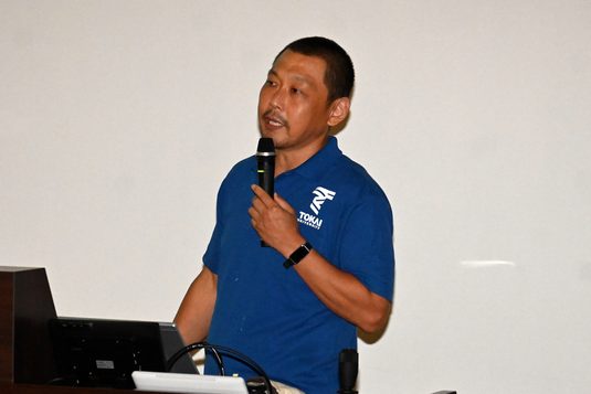 続いて、堀江琢准教授が「変化する駿河湾にやってくるサメたち」をテーマに、駿河湾にも多く来遊するなど日本沿岸におけるサメの目撃情報や漁業被害が増加している現状について説明。1992年から本学科の教員によって続いている駿河湾の定置網で捕獲される外洋性サメ類について、長期間にわたる調査結果を紹介するとともに、「減少傾向のサメ類は個体数自体が減ったのか、環境変動による生息地の変化なのか、サメは世界的に保護対象であり、さらなるモニタリングが必要」とまとめました。