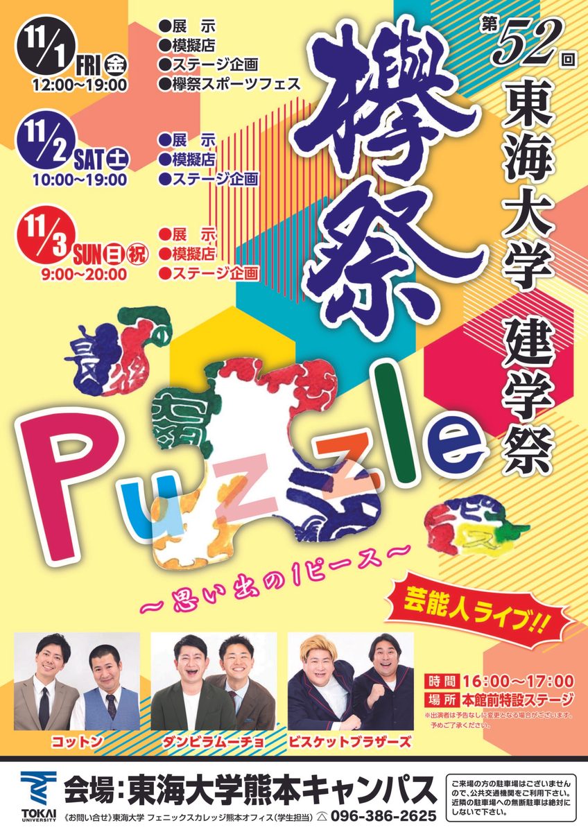 【Puzzle~思い出の1ピース】にはすべての方が主役のPuzzleであると同時に、思い出の1ピースになれるものを作り、ご来場いただく皆様の記憶に残るような建学祭をお届けすることを目的に実施します。