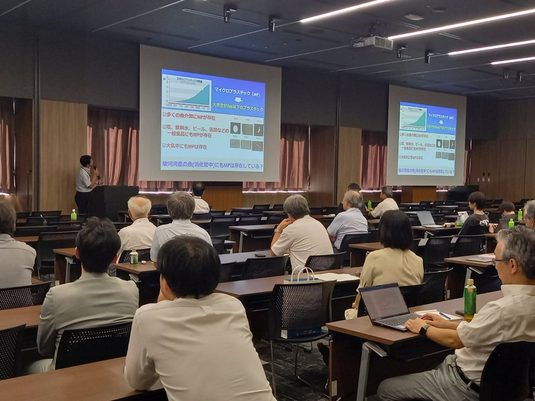 清水准教授は、「マイクロプラスチック(MP)の体外排泄に向けた取り組み」をテーマに講演。「MPを摂取してしまうとさまざまな臓器に蓄積され、炎症反応が亢進し、多くの疫病リスクが高まるといわれています。MPによる健康リスクは将来顕在化する可能性が高くなっています」と現状を説明し、「一方で、プラスチックのない世界をすぐに実現することは難しく、私たちはMPを体に蓄積させず、速やかに排泄する方法について研究しています」と話しました。清水准教授の研究室では、ラットに成分が異なるエサを与え、24時間ごとに糞を回収。それぞれのMP数を計測するだけでなく、解剖消化管中のMP数を分析した結果、「MPとキトサンを併用摂取した場合、速やかに排泄されやすいという研究成果が出ています。今後もさらなる排泄促進素材を探索するとともに、MP摂取が味覚に及ぼす影響についても研究していきたい」とまとめました。