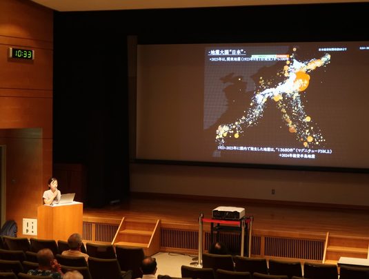 海洋学部海洋理工学科の横山由香助教が、9月21日に静岡県地震防災センターで開催された「ふじのくに災学講座」で講演しました。静岡県では、県内の国公私立大学(静岡大学、浜松医科大学、静岡県立大学、静岡文化芸術大学、常葉大学、東海大学)と県教育委員会などによる「しずおか防災コンソーシアム」を形成しており、本講座はこのコンソーシアムが実施する防災に関する啓蒙活動の一環として県内各地で定期的に開かれています。