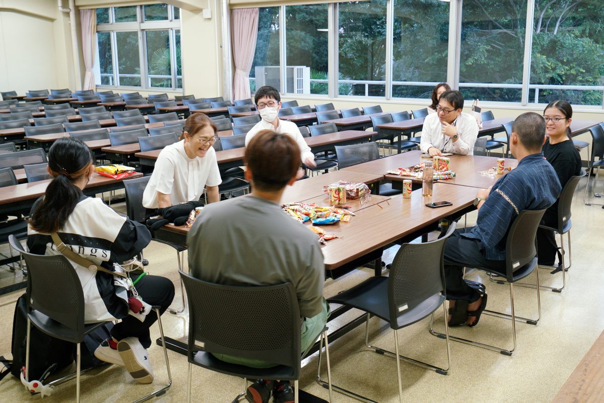 約20名の学生が参加した当日は、新1号館の教室に出身県や地域ごとの会場を設け、各会場にコーディネーター役の教職員約30名を配置。それぞれに自己紹介やフリートーク、トランプなどのゲームを通じて交流し、熊本で見つけたおすすめの店舗や担当職員おすすめの観光スポット、夏季休暇の思い出などさまざまな話題で懇親を深めました。