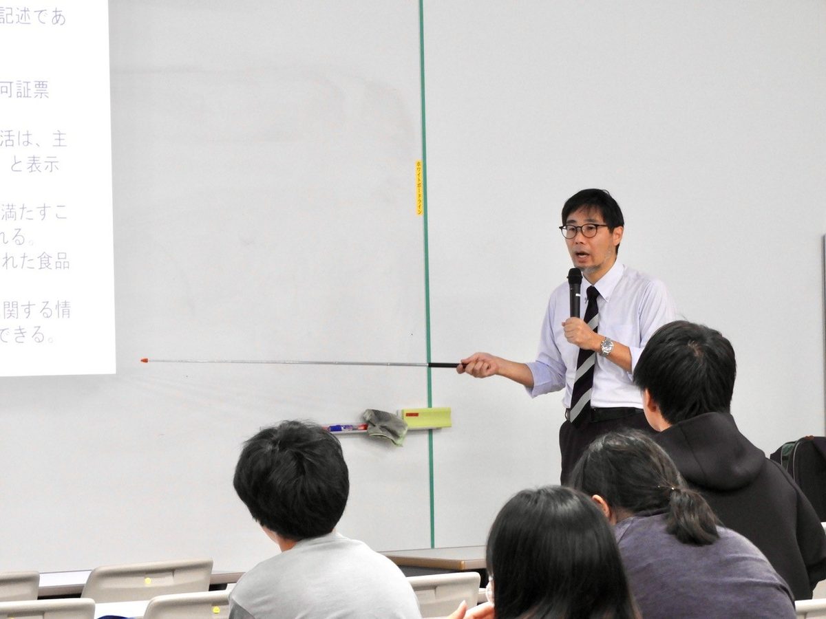 今回は、狩生 徹 氏(尚絅大学生活科学部栄養科学科 教授)を講師に迎え、「食品機能性の科学」についての研修講義が行われました。農学部の応用植物科学科(現:農学科)、応用動物科学科(現:動物科学科)、バイオサイエンス学科(現:食生命科学科)の4年次生が参加し、特定保健用食品や機能性表示食品と一般の食品の違いをはじめ、食品に含まれる機能性成分が体にどのように働くか、食品表示や法律などについて学びました。