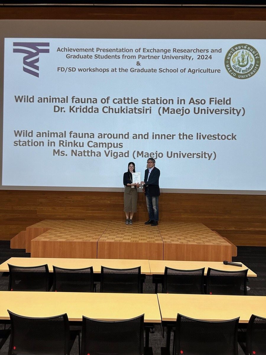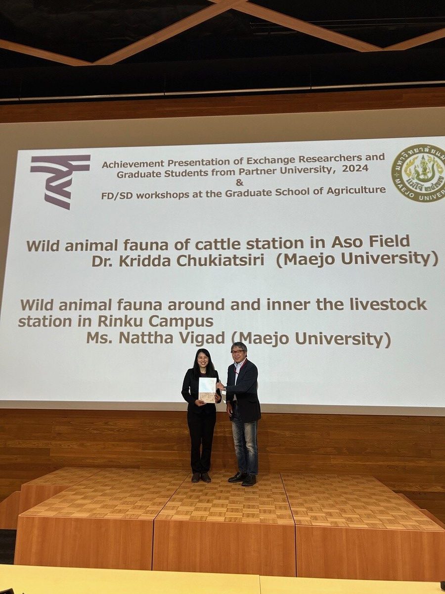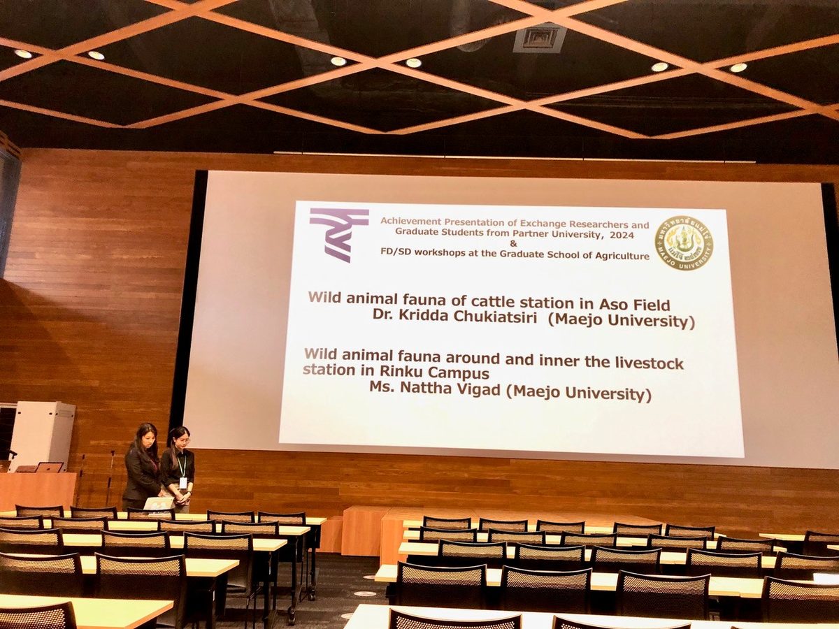 農学研究科では、メジョー大学からの交換研究者であるDr. Kridda Chukiatsiri(クリッダ・チュキアツリ博士)と交換留学生のMs. Nattha Vigad(ナッター・ヴィガードさん)の研究成果発表会を実施しました。