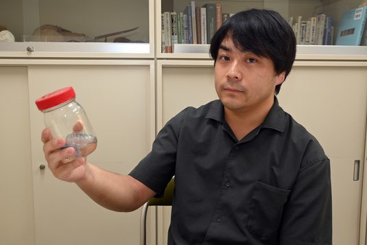 生態進化発生学が専門で、環境によって姿かたちを変化させるシロアリなどの昆虫をはじめとする無脊椎動物を対象に研究する小口講師は、今年度から本学部で教鞭を執りつつ、東京大学大学院理学系研究科附属臨海実験所在籍時から取り組んできた本研究を進めてきました。「個体同士で役割分担するシロアリなどの社会性に関心があり、研究者の道を歩んできました。その中で、無性生殖によって生まれた個体(個虫)が繋がりあって生活する『群体』をつくるカツオノエボシの生態に興味を持ったことが本研究に取り組むきっかけです。カツオノエボシは世界中に分布し、強い毒で人的被害をおよぼします。さらに研究を深化させ、生殖枝がいつどこで本体から切り離されるのか、どのように成熟し、配偶子が放出されるのか解明したいと考えています。カツオノエボシの生活史の全貌が明らかになれば、いつどこで生まれ、海岸に漂着するのかが分かり、海岸での安全確保にも寄与できるのではないかと期待しています」と話しています。