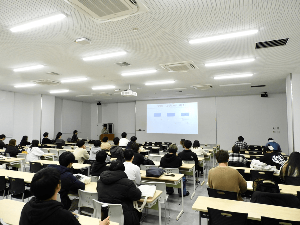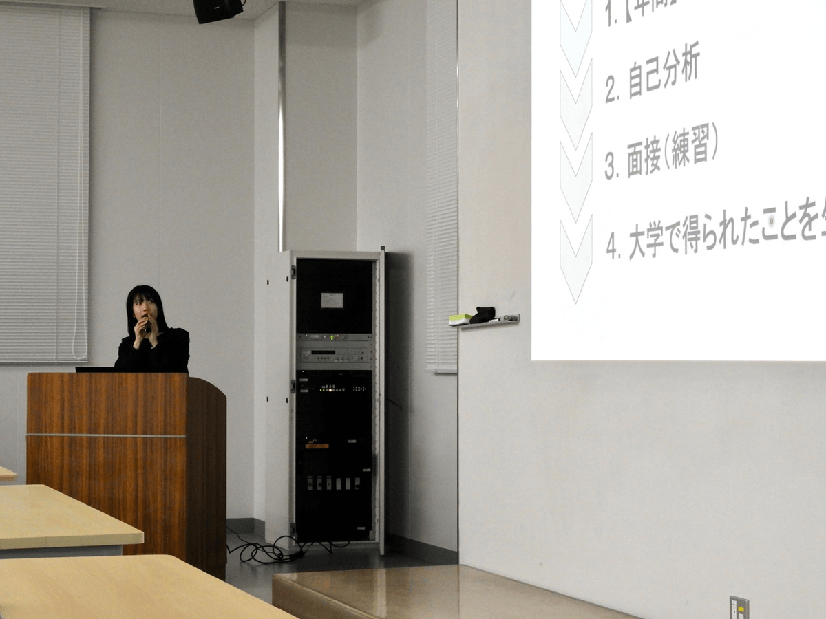 12月2日に農学部食生命科学科主催の就職支援行事「就活(勝)」イベントが開催されました。このイベントは、農学部生・大学院生・他学科生が参加できるオープン形式で行われ、バイオサイエンス学科(現食生命科学科)4年生5名と大学院農学研究科修士課程1名が登壇し、企業・学校教員・協同組合への就職や大学院進学など、それぞれのキャリア形成に関する具体的なエピソードが語られました。質疑応答の時間では、後輩たちからの質問に対し、先輩たちが自身の経験をもとにアドバイスを行う場面も見られました。
