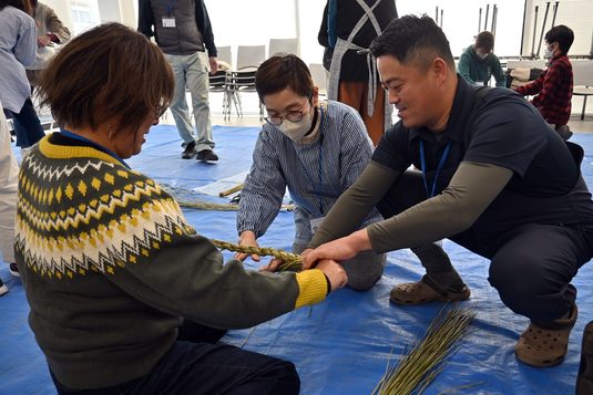 その後は中野技術職員やサポートの学生らも加わり、参加者が本学部産の稲わらを使ったしめ縄と、針葉樹の一種であるハイビャクシンとローズマリーを用いたスワッグを制作。スワッグにはサンタクロースやリボン、松ぼっくりなど、思い思いの飾りをつけて完成させました。松田准教授は、「スワッグに紅白のツバキや南天の実、水引などを飾り、しめ縄と組み合わせればあっという間にお正月らしくなります。クリスマスが終わったらご自宅でアレンジしてみてください」と語りかけました。参加者は、「これだけの材料を用意して作るのはハードルが高いですが、一つひとつ丁寧に教えていただき形にできました。自分の作品は愛着が持ててうれしい。大切に飾ります」「しめ飾りのいわれなど知らないことも多く、勉強になりました」と話していました。