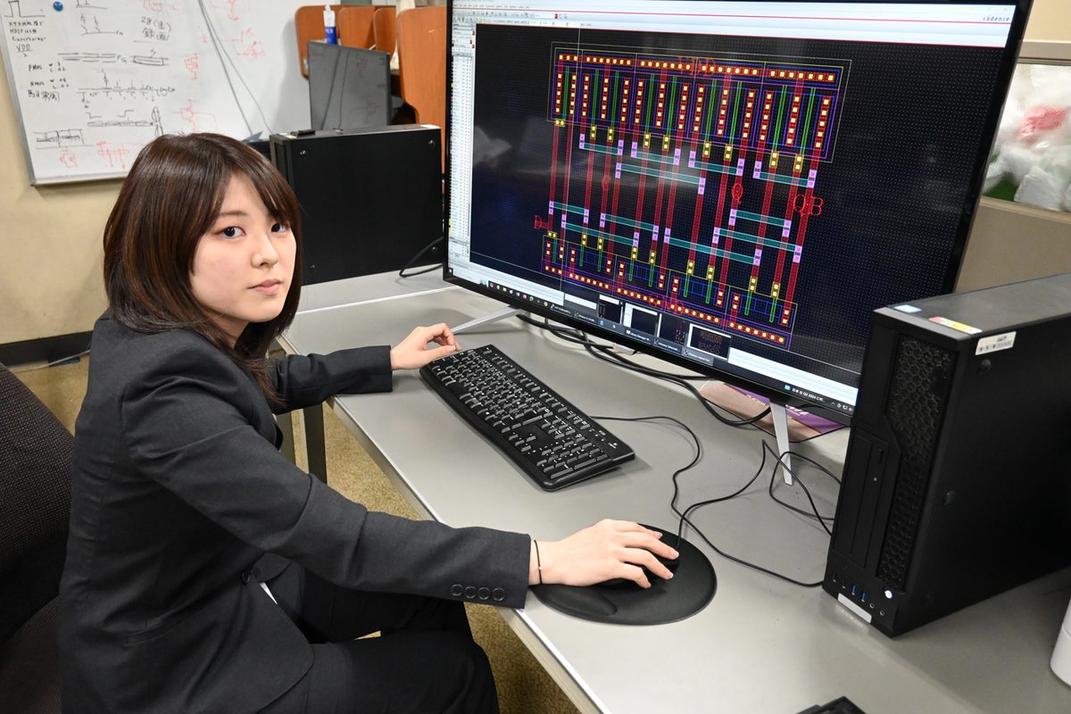 本学科では3年次生の秋学期から研究室に所属しますが、藤本教授は学年に関係なく研究に興味のある学生に門戸を開いています。川人さんは、「スマートフォンや自動運転など、祖父母が子どものころには考えられなかったものが現代では当たり前になっています。これから先もどんどん進化していく技術を身に着け、知識を持って未来を迎えたいと考えるようになりました」と語ります。「もともと考古学に興味のある文系学生だったので、理系の研究は苦労しましたが、先輩方からプログラムの書き方やソフトの使い方など一つひとつ教えてもらって学んできました。初めての学会で、発表の前日まで原稿を作っていたので、まだまだ準備が足らないと感じました。今は、実際に作った回路でこれまでの人工知能が挑戦してきた複雑な問題に挑戦しており、いい感覚もつかめています。さらに研究を深め、学会などで発表していきたいです」とコメント。藤本教授は、「大学院生が多く発表した中で学部3年次生が受賞するのは異例のことです。川人さんは理系に転向してから自身が研究室で学んできたことを後輩に伝えていくために、オリジナルの教科書も作ろうとしています。半導体の体験イベントなどでもスタッフを務めてくれており、今後の活躍が楽しみです」と話しています。