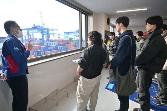 静岡キャンパスが開講する授業「海洋政策」を履修する学生たちが、1月15日に静岡市・清水港を見学しました。本学は2023年に、国土交通省中部地方整備局清水港湾事務所と連携・協力に関する協定を締結。持続可能で活力のある国土・地域づくりや教育・研究の推進、地域社会貢献に向けてさまざまな取り組みを展開しています。今年度の秋セメスターに開講しているこの授業では、指導に当たる仁木将人教授と共に清水港湾事務所の田中大司所長が登壇し、海洋の多様な開発・利用・保全に関する知識を清水港周辺の実例を挙げて講義しています。