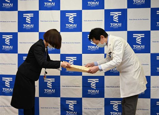 伊勢原キャンパスの医学部付属病院が1月27日に、日本赤十字社から感謝状を贈呈されました。当院では1978年5月から赤十字社の献血活動に協力しており、記録が残っている1994年以降では延べ5,000名が献血に協力しています。また、近年では献血の実施時間を学生の休憩時間と重ねるといった工夫で医学科、看護学科の学生もこれまで以上に参加できるようにしていることから、一日の目標数も随時達成できています。今回の感謝状は40年以上にわたる協力に対して贈られたものです。