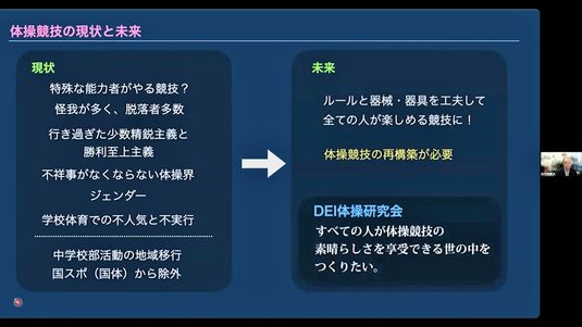 約40名が参加した当日は初めに、同研究会会長を務める小河原部長が登壇。体操競技の現状を語り、「2024年のパリ五輪では、日本代表の男子団体チームが金メダルに輝くなど注目を集めましたが、パラリンピックでは体操競技が開催されていません。国内では知的・発達に障がいがある子どもが体操を経験できる環境が少なく、活動の場所が必要だと考えます。また、幼少期から体操競技に触れていても、けがなどを理由に中学や高校、大学と競技を続ける人が少なくなっていきます」と課題を指摘しました。近年、国内でも盛り上がりを見せるマスターズ大会にも触れ、「体操競技のルールや器械、器具を工夫して、障がいの有無や年齢を問わず全ての人が楽しめる競技に再構築する必要があります。DEI研究会では、その一助になれるよう活動していきたい」と話しました。