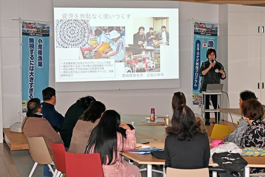 2部制で実施した当日は、TBTI Philippinesのメンバーを学生や地元漁業関係者ら約30名が歓迎。李准教授が、「フィリピンの沿岸漁業や小規模漁業を研究するTBTI Philippinesは、フィリピン大学を中心とした30以上の大学の関係者によって、2023年度に立ち上げられました」と紹介しました。第1部の講演では、初めに人文学部の関いずみ教授が登壇。「漁業・漁村と女性」と題して日本の漁業において女性が担ってきた役割や、各漁村の女性組織による取り組みを解説しました。続いて、フィリピン大学副学長のアリス・ジョン・フェラー氏より、同大学の学生がフィリピンの漁村地域に住む女性たちにインタビューをして制作した動画を上映しました。各講演終了後の質疑応答では参加者から多くの質問が寄せられ、活発な議論が交わされました。