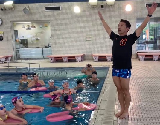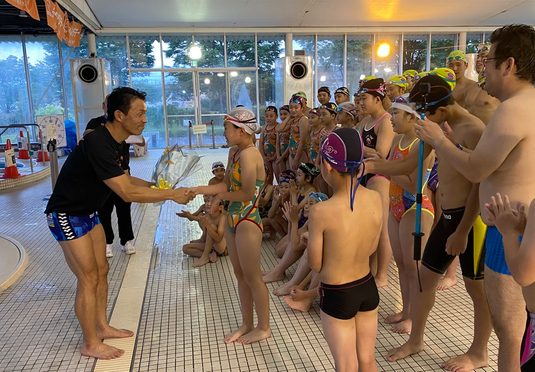 当日は、小学校2年生から6年生までの約40名が参加し、2週間の体調観察など新型コロナウイルス感染症の対策を講じたうえで実施しました。会場では加藤部長と選手が自由形、背泳ぎ、平泳ぎ、バタフライの泳ぎ方を約2時間にわたって指導。水泳部でも取り入れているドリルワークを応用し、水中でビート板をお腹や腰の下に入れて体を浮かした状態でさまざまな角度から足や手の動かし方まで細かく指導しました。閉会後には参加者から「どうやったら平泳ぎがうまくなりますか?」「バタフライがうまく泳げないのですが、どうしたらいいでしょうか」「大会でいいタイムを出す秘訣はありますか?」などさまざまな質問が寄せられました。