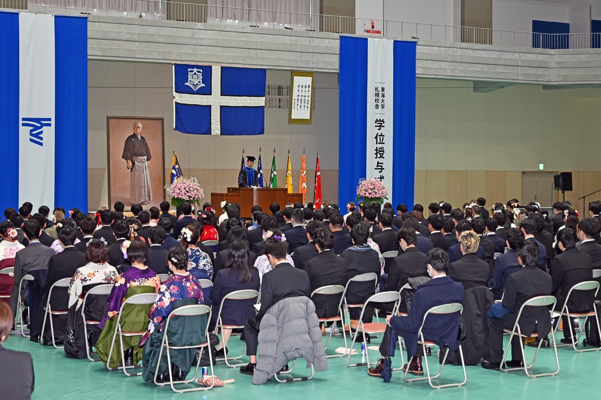 式辞では網野札幌キャンパス長が松前義昭総長・理事長からのメッセージを代読し、「学園の創立者・松前重義は、東海大学の母胎である望星学塾に『若き日に』から始まる4つの言葉を掲げました。『若き日に』は一生における青春を示唆している言葉で、『思想を培え』『体躯を養え』『知能を磨け』は青春を保つための手段であり、人生をよりよくする指針でもあります。『希望を星につなげ』は、“人生における青春をいつまでも続けよ”と創立者が皆さんに残した言葉であり、本学で学んだ皆さんにはこれからの人生を前向きな姿勢で歩んでいただきたいという願いが込められています。一時的な成功や目標の達成は一瞬で過ぎ去ります。過去は取り戻すことができません。後悔のない人生を送るためにも、しっかりとした人生観を持って日々を過ごしてください」と語りかけました。