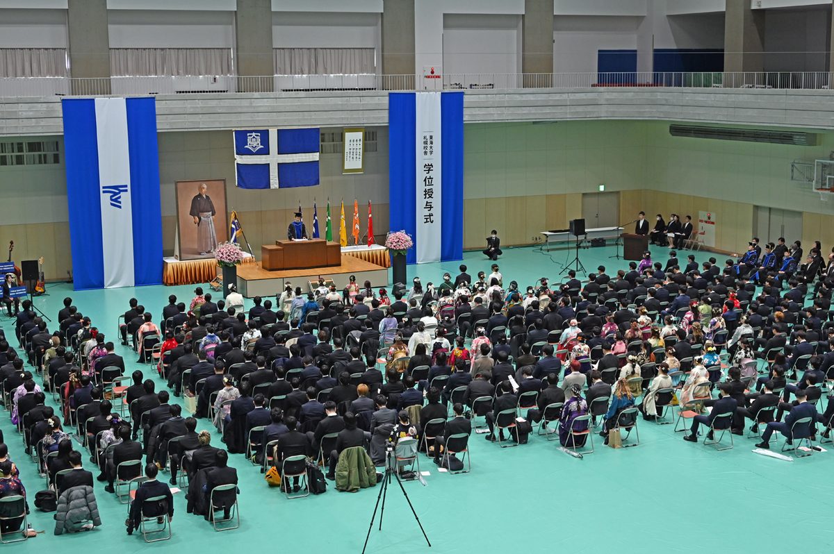 また、来賓を代表して東海大学同窓会北海道ブロックの本間雅実会長が祝辞を述べ、「卒業を迎えるまで、新型コロナ禍をはじめさまざまなことがあったと思います。皆さんは未曾有の情勢を乗り越えてこの日を迎えました。ぜひ自信を持ってください。明日からは東海大学の同窓生の一人になります。北海道内はもちろん、全国各地で活躍する45万人が皆さんの仲間です。全国どこでも、皆さんは東海大学の同窓生と強い絆で結ばれています。皆さんには無限の可能性があります。夢に向かって元気に羽ばたいてください」と励ましました。校歌の斉唱に続き、網野札幌キャンパス長が閉式の辞として、「皆さんの人生は、皆さん自身のものです。もちろん一人では生きていけませんし、友情や絆、他者への思いやりは大切なものです。しかし、相手に依存し決断をゆだねてばかりでは、自分の人生を豊かにすることはできません。一度きりの自分の人生を、かしこく、力強く、しなやかに歩んでいってください」と語りました。