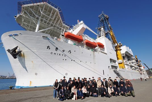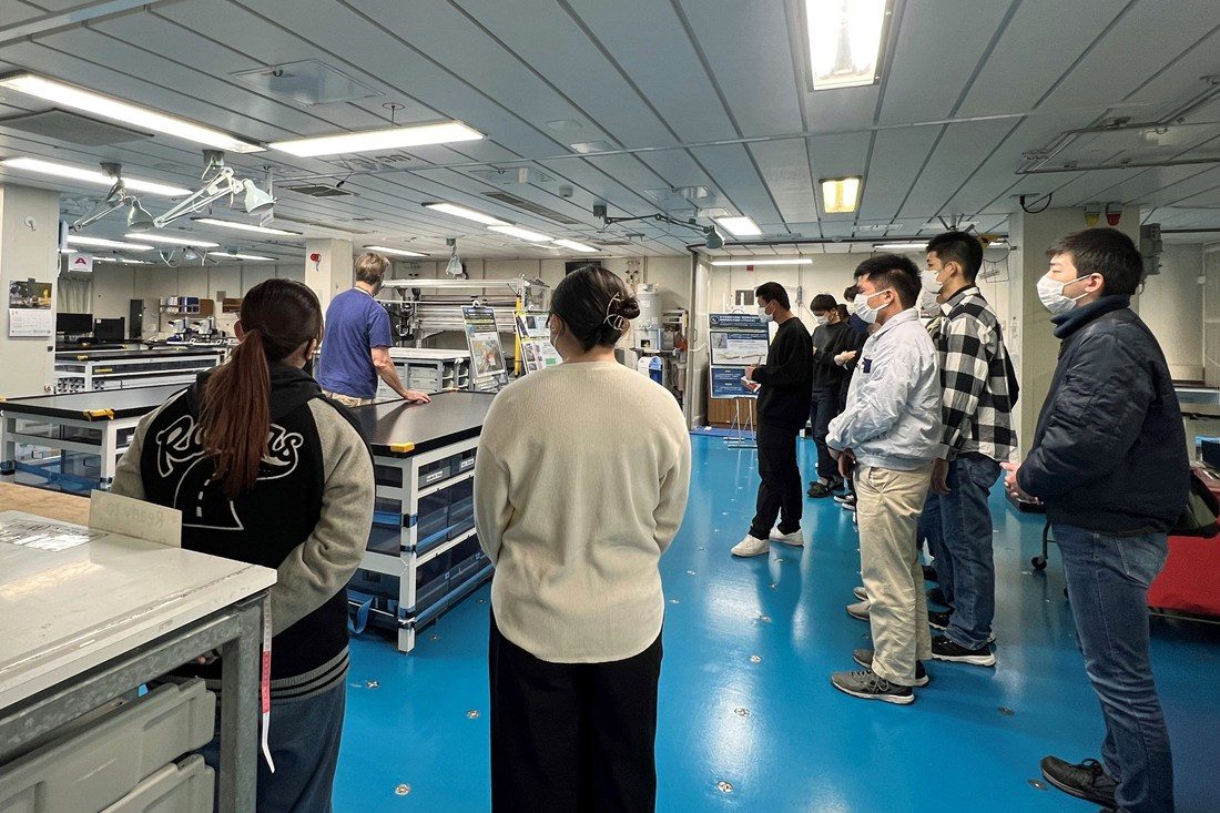 海洋学部海洋理工学科では2月25日から28日まで静岡キャンパスなどで、ウィンターセッション科目「海洋理工学英語B」を開講しました。海洋に関する法制度や海の安全・環境政策などに関する英語の論文や記事を読み、国際的な視点で海洋政策への理解を深めることを目的としています。昨年度までは静岡キャンパス内での講義を中心に行っていましたが、今回は海洋研究開発機構(JAMSTEC)元理事長で、海洋研究所所長の平朝彦教授の発案で、JAMSTECの地球深部探査船「ちきゅう」を初めて見学しました。