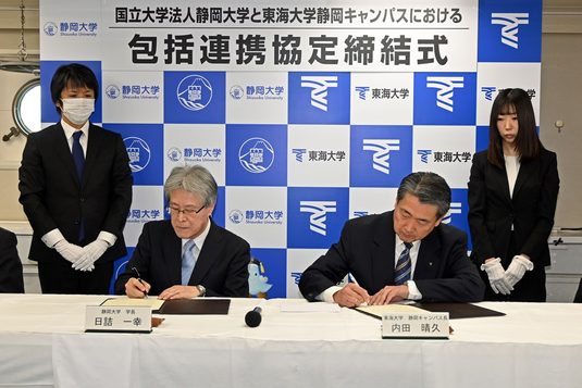 静岡キャンパスではこのほど、国立大学法人静岡大学と「包括連携に関する協定」を締結。3月27日に、静岡市・清水港に停泊中の本学海洋調査研修船「望星丸」(国際総トン数=2174トン)で締結式を実施しました。本キャンパスではこれまで、静岡大との共同研究を展開してきたほか、静岡県や静岡市などが進める「駿河湾・海洋DX先端拠点化計画」の一環で、海洋を巡るさまざまな課題解決を目指す「マリンインフォマティクス研究機構」の設置に向けて、静岡大をはじめとした県内の各大学と連携してきました。今回の協定締結は、それぞれの特色を生かして、教育や研究、人的交流などを推進する包括的連携体制の構築を目指すものです。
