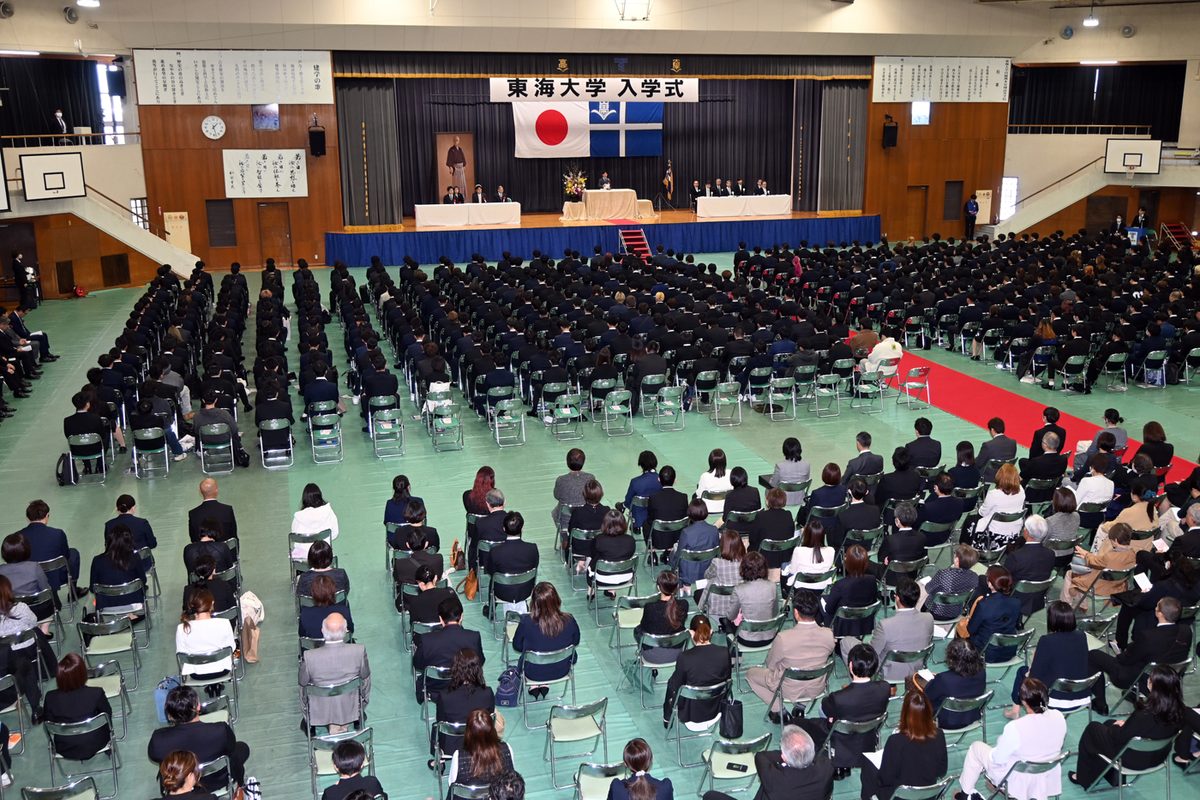 式辞では木村英樹学長が登壇し、創立者・松前重義博士が学園の母胎である望星学塾に掲げた「若き日に汝の」から始まる「思想を培え」「体軀を養え」「智能を磨け」「希望を星につなげ」の4つの言葉を紹介。「将来の夢や希望の実現には困難な道のりが待っているかもしれません。継続は力なりという言葉がありますが、日々小さなチャレンジを続ければ大きな成功を得られると数多くの偉人が言っています。希望を星につなぐことは、継続する力と言えるのではないでしょうか」と語りかけました。さらに、社会的実践力を養うために本学が育成する4つの力「自ら考える力」「集い力」「挑み力」「成し遂げ力」にも触れ、「東海大学には数多くの優秀な先生方、それをサポートしてくれる職員の皆さん、たくさんの先輩方がいます。ぜひ積極的に関わるとともに、留学制度やToCoチャレといったさまざまな仕組みを使い倒してください」と期待を寄せました。