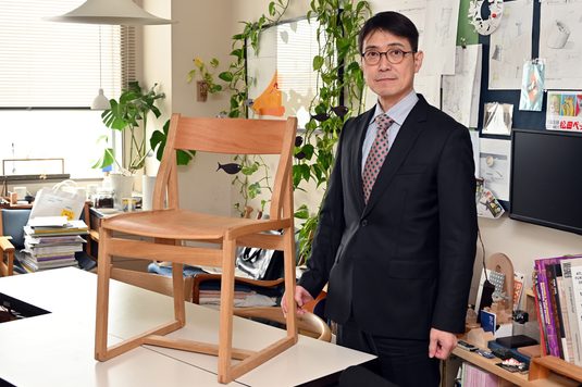 今回のリニューアルは、これまで使われてきたブナ材から北海道産のナラ材に切り替わることになったことからデザインの一部を変更したものです。中尾教授は、「当時は学校で日常的に使用するものであることから特に壊れにくく頑丈に作ることを目指したデザインが採用されました。約15年間同じものが製作されてきましたが、重量が5kgあるため、実際に使用した生徒からは“重たい”といった声も多く寄せられており、材料が切り替わるタイミングでデザインも見直すことになりました」と話します。リニューアルされた椅子は、座り心地を変えることなく、本体横のフレーム部分を細くするなどして約20%の軽量化を図りました。「フレームを細くしても簡単には壊れない強度が保てると判断しました。また私自身、フレームや背もたれの幅などもっといいものにできる部分があるのではないかと考え続けてきたこともあり、今回のリニューアルでより椅子らしく、暮らしの中に溶け込むデザインに仕上がったと感じています」と語っています。