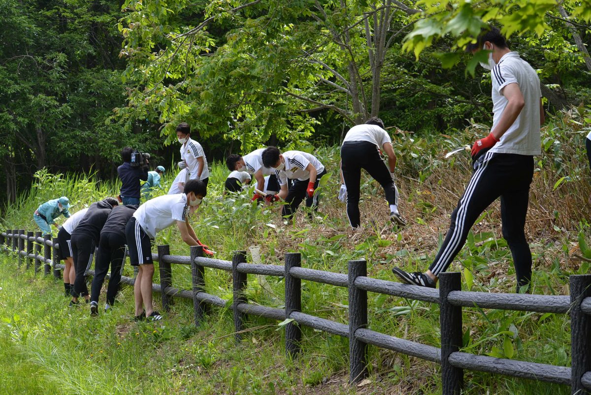 札幌キャンパスで活動するサッカー部とスチューデントアチーブメントセンター・チャレンジプロジェクト「札幌ボランティアプロジェクト」、国際コミュニケーション学科 ハミルトン マーク教授の卒業研究ゼミナールの学生有志が6月20日キャンパス付近の南沢スワン公園でNPO法人TSUNAGU主催 熊対策「草刈りプロジェクト」に参加しました。