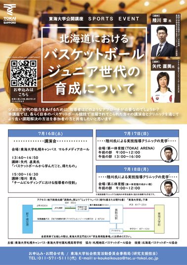 札幌キャンパスでは7月16日(土)から7月18日(月)までの3日間、東海大学公開講座 SPORTS EVENT「北海道におけるバスケットボールジュニア世代の育成について」を開催します。