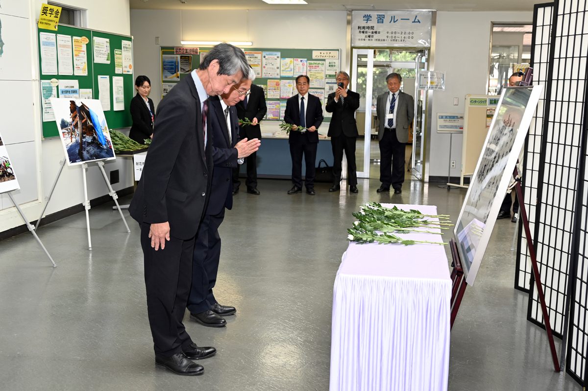 熊本キャンパスでは、午前10時から午後4時まで新1号館1階のホールに阿蘇の方角に向けて献花台を設置。昼休みの時間帯には木之内均副学長(九州キャンパス担当)や副学長付の荒木朋洋教授、基盤工学部の藤本邦明学部長、文理融合学部の前田芳男学部長ら教職員に加えて、九州学生会のメンバーらが献花台を訪れ、黙祷を捧げました。阿蘇くまもと臨空キャンパスでも同時刻に2号館1階のゲートプラザに常設されている碑に向かって献花台を設営。こちらも昼休みの時間帯に農学部の星良和学部長、大学院生物科学研究科の小野正輝研究科長、農学研究科の岡本智伸研究科長が献花しました。また、両キャンパスともキャンパス内放送で「犠牲になられた方々の冥福を祈り、心を共にすることで被災地域への思いを新たにしてください」と呼びかけました。