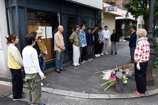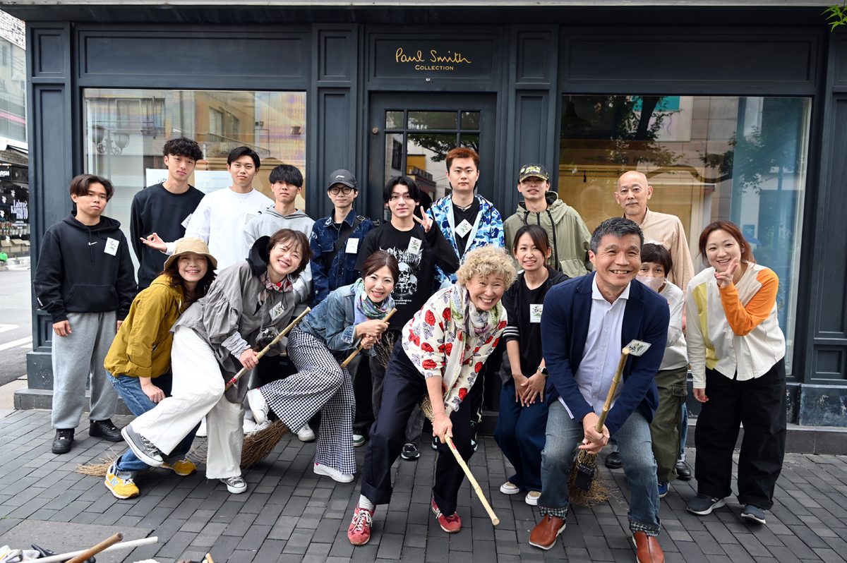 当日は、Paul Smith Collectionの店舗跡地前に集合。学生たちは自己紹介した後に、オーナーや他の参加者とともにほうきやちり取り、ごみ袋を手に通りの東端から西端まで手分けして歩道などのごみを集めて歩きました。終了後にはオーナーが経営する他ブランドの店舗に移動。1970年代に国内でも最先端のファッション文化発信地だったシャワー通りについて、その変遷や文化、ポール・スミス氏をはじめとした海外で活躍するファッションデザイナーとの交流、セレクトショップなどアパレル店経営のポイントなど多彩な話題を語りました。