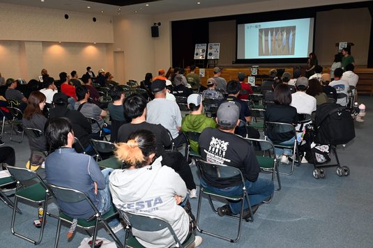 学生たちは、ダイビング活動ができない冬季の間に「アングラーの集い」の関係者らとルアーのリペアに取り組み、ペイントをほどこすなど準備を進めてきました。イベントの当日には、メンバー4名が「アングラーの集い」参加者と共に神恵内村内の海岸で清掃活動に加わった後、会場内に販売ブースを設営。リペアしたルアーや活動紹介のパネルを並べて来場者に活動をアピールするとともに、希望者への販売も行いました。また、釣り人へのマナー向上や安全確保を呼びかける講演の合間にはメンバーが壇上に上がり、「もぐって☆Reルアー」の活動をプレゼンテーション。「海岸や海中がきれいになれば生物の住処が守られ、環境保護が進めば釣りのスポットとしても解放されることが期待できます。泊村や神恵内村のある積丹半島を中心に活動ポイントを増やしていきたい」と展望を語りました。
