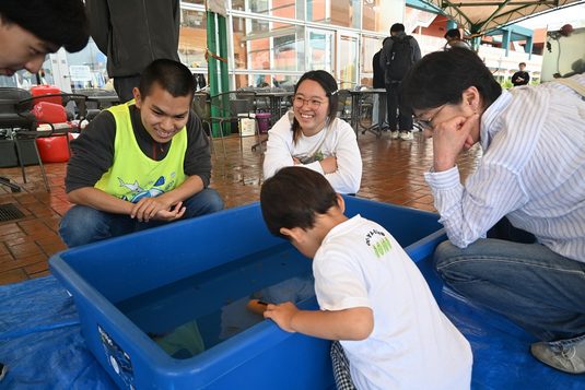 水槽展示を担当した手嶋謙さん(海洋学部3年次生)は、「自分たちが海中で見た風景をできるだけ忠実に再現できるよう、細部までこだわって準備してきました。多くの方に楽しんでもらえて、とてもうれしい」と笑顔を見せました。部長の川崎優人さん(同)は、「水族応用生態研究会のメンバーは、キャンパスだけでなく自宅でも魚の世話をしています。日ごろの活動の成果を子どもたちに伝えることができてやりがいを感じました。これからもさまざまなイベントを通じて、駿河湾や水生生物の魅力を発信していきたい」と目を輝かせていました。