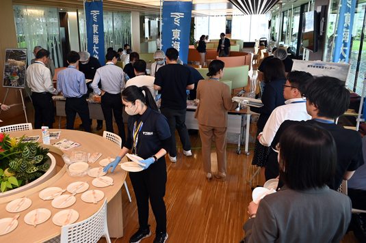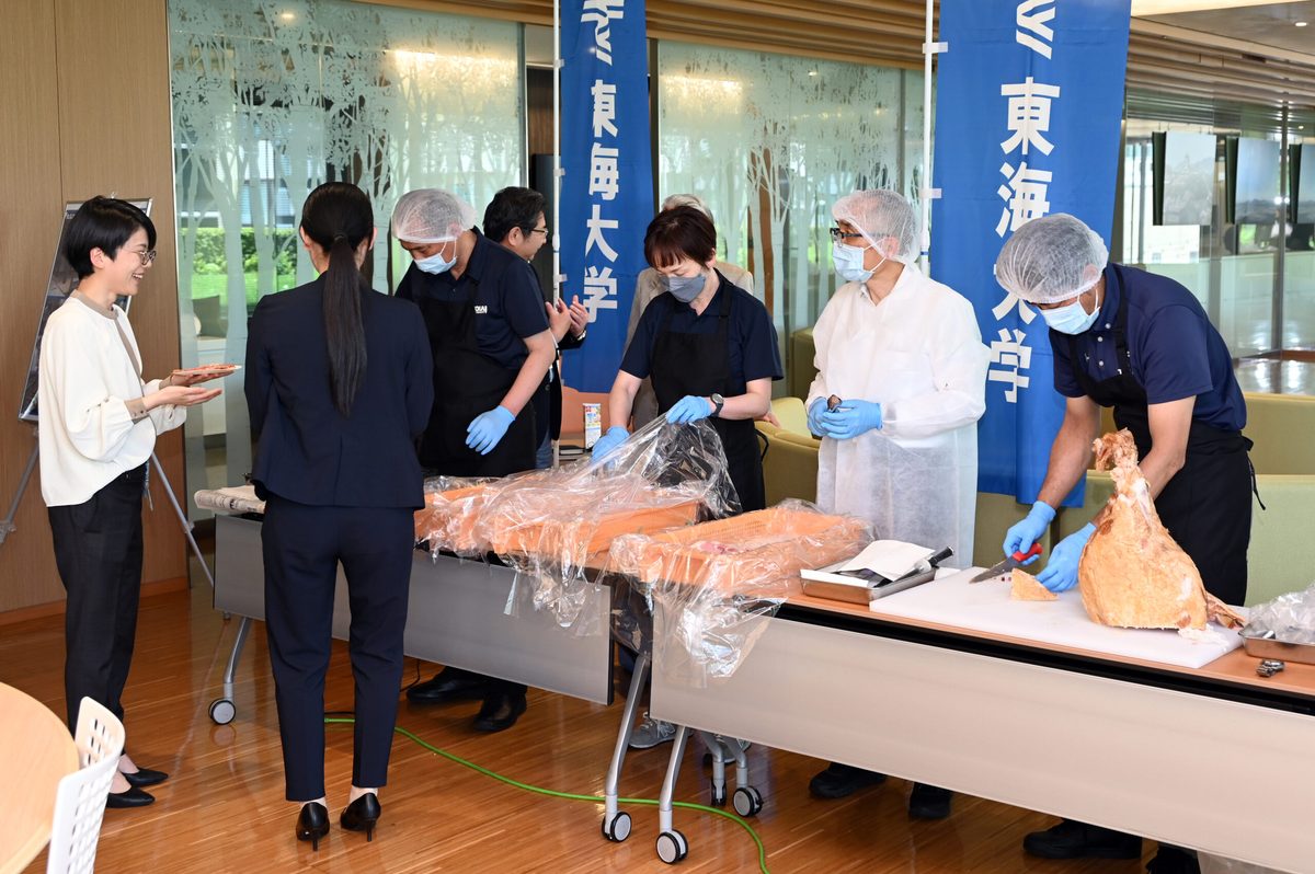 荒木教授と岡本センター長は、「地域産業の振興に大きく関与する地元の大手銀行の皆さんに、本学が持つ知見や技術を知っていただくよい機会になったと感じています。ハムやベーコンは学生たちも実習等で加工に挑戦しており、毎年11月に開いている建学祭『欅祭』でも地域住民の皆さんから大変好評を得ています。今回も“どこで買えますか”といった質問も多く寄せられました。今後、ASOを中心としてさらなる産学連携を進めていくきっかけになったと感じています」と話しました。また、肥後銀行地域振興部の大野隆部長は、「産学連携協定に基づいた初めての活動として東海大学の皆さんにお越しいただきましたが、約500名が勤務する当行本店の行員が農学部の魅力に触れる機会になりました。地元企業が求める研究シーズとのマッチングなど私どもが果たせる役割も多くあるので、相互理解を深めながらさらなる発展を図っていきたい」と期待を寄せました。