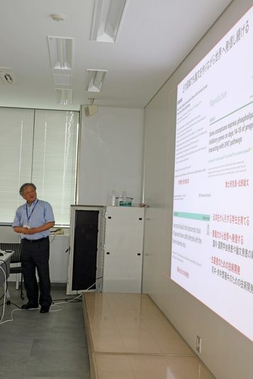 総合農学研究所では6月16日に阿蘇くまもと臨空キャンパスで、「ランチョンセミナー」を初開催しました。教員の研究内容や最新の研究話題を共有しようと企画したもので、第1回は本研究所の今川和彦所長が講師を担当。「研究に魅せられて From basic science to the world and fields」をテーマに登壇し、学生や教員ら約40名が参加しました。