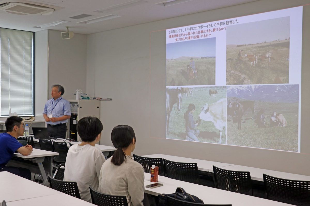 今川所長は、49年前にアメリカで農業研修生として働いたことをきっかけに研究の道に進んだ経緯について、「1300頭のウシを観察し続けた結果、800頭ほどの顔とナンバーが一致するようになりました。そこで人工授精にも取り組み、ネブラスカ大学の大学院に進んで研究を続けました」と振り返りました。続けて、現在も取り組んでいるウシの繁殖に関する研究について詳しく解説し、日本における牛肉の輸入量と生産量のデータも示して、日本の畜産業が輸入に依存している現状を指摘。さらに、日本のウシの分娩間隔が425日と長いことや、受胎率の低下について触れ、「受胎率が10%低下すると日本の畜産業に年間約50億円の損失をもたらします。また、受精率は95%と高い数値を維持しているにも関わらず、妊娠率は50%にとどまっており、この問題を解決するための研究を進めています」と話し、「私の研究室では基礎研究の成果を世界に発信し続け、これをもとに技術を開発して生産現場に生かそうと取り組んでいます。こうした取り組みがもっと進んでいけば日本の経営基盤の強化にもつながります」と力説。共同研究の大切さを説くと共に、自身が国内外の多くの研究機関と協力して取り組んでいる研究についても紹介しました。講演後には、アメリカでの経験やキャリア形成について質問が挙がり、今川所長が詳しく回答しました。