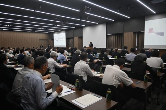 当日は、県と市の職員や参画機関の関係者ら約200名が出席。静岡キャンパスからは、川﨑一平副学長(静岡キャンパス担当)や齋藤寛海洋学部長ら教職員が参加しました。冒頭で静岡市の難波喬司市長と静岡県の平木省副知事が登壇し、計画の意義と今後の展望を説明。続いて、事業責任者の橋本正洋氏(一般財団法人マリンオープンイノベーション機構理事・統括プロデューサー)が、「欧米でも“ブルーテック”と呼ばれる同様のクラスターが複数ありますが、日本にはこれまで存在しませんでした。静岡のプロジェクトが、国内初の先進的な取り組みとなるでしょう」と語りました。