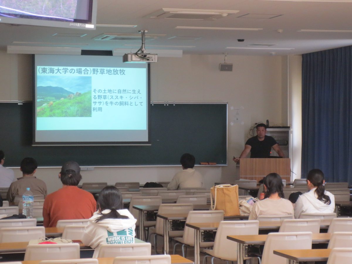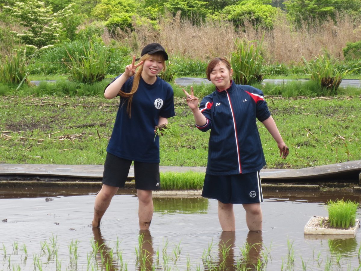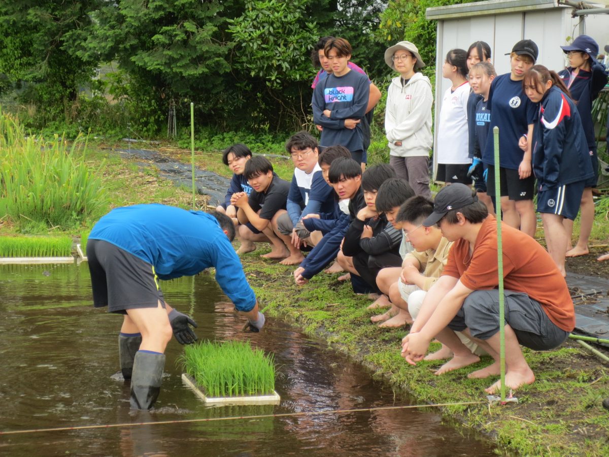 今年度の農学基礎実習は、5月10日に阿蘇フィールドで実施し、農場実習では本学農学部のオリジナル米である「阿蘇乃舞」の田植えを行いました。実習にあたり、講義を通して阿蘇乃舞や植え付け方法について学び、その後、学生全員で田んぼに入り田植えを行いました。牧場実習では、放牧しているあか牛の観察や牛の体尺測定、飼養管理についての技術を学びました。天候にも恵まれ、実習でしかできない経験を得ることができました。