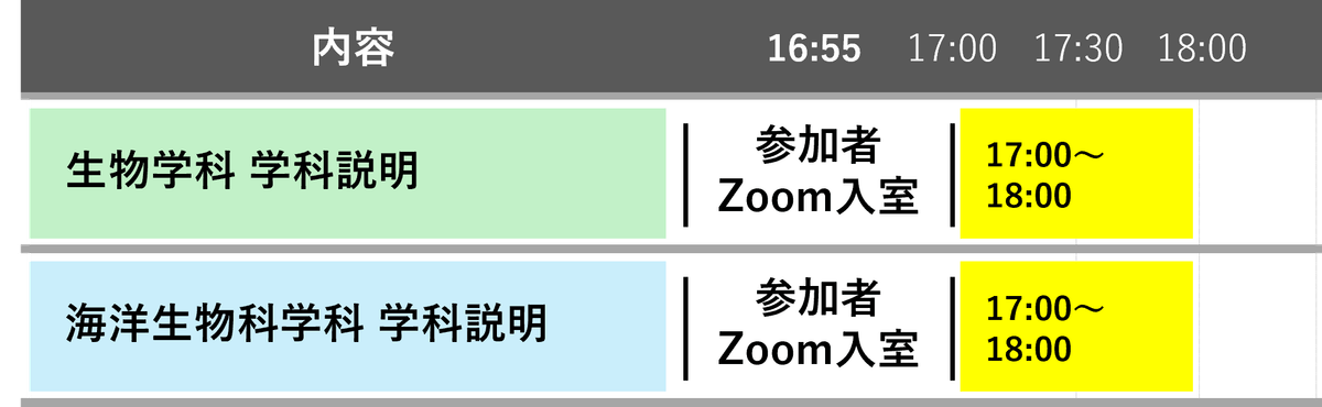 国際文化学部(地域創造学科、国際コミュニケーション学科)は来場型、生物学部(生物学科、海洋生物科学科)はオンライン型で実施いたします。