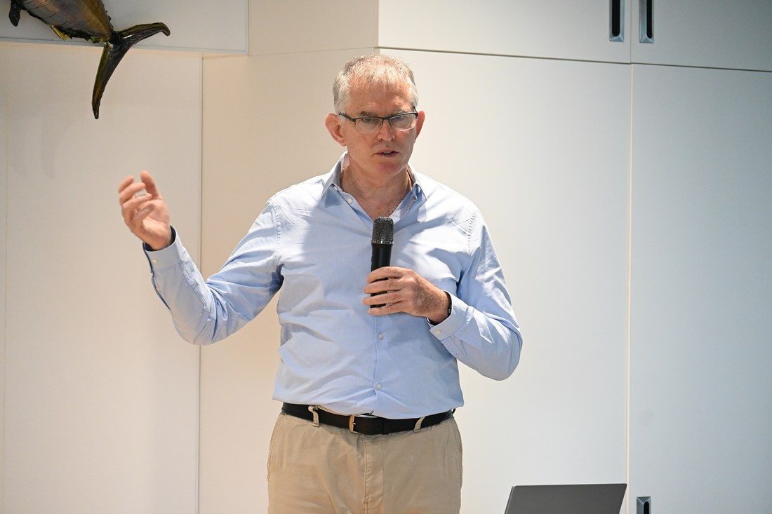 当日は李准教授がモデレーターを務め、海洋学部の学生や静岡県内の漁業関係者、研究者、一般参加者など約40名が参加しました。海洋学部学部長の齋藤寛教授の歓迎のあいさつの後、基調講演ではパーベス氏が「小規模マグロ漁業の未来―近代化と革新の必要性―」をテーマに、「一本釣り漁業は、本来目的としていない魚や海洋生物を誤って捕獲する可能性が低く、海洋資源の保全につながります。また、経済的に脆弱な地域でも展開しやすい漁法の一つで、地域の雇用の創出にも貢献します」と説明しました。そのうえで、「現状では政府の漁業補助金の多くが大規模漁業に充てられています。環境保全や持続可能な漁業のためには、小規模漁業にAIを導入するなどの近代化や能力構築に資金を投じるべきです」と述べ、「日本の漁業は歴史が深く、世界への影響力も大きい。小規模漁業の活性化に向けて、ぜひ力を貸してほしい」と呼びかけました。
