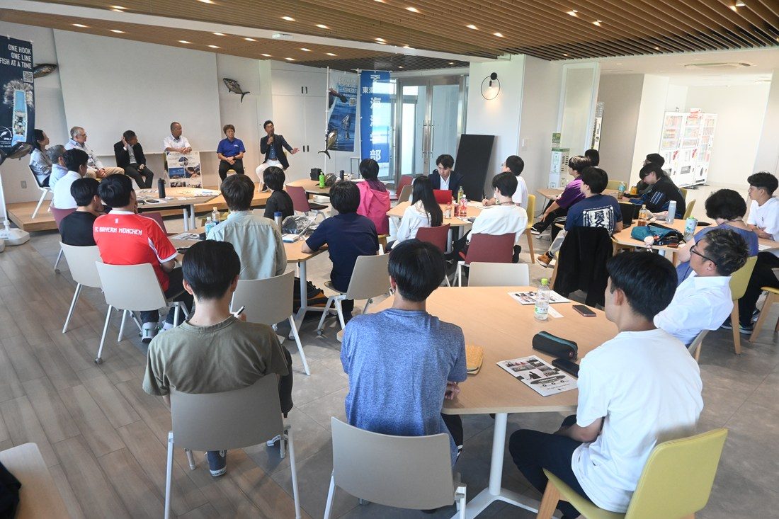 後半のトークセッションでは、李准教授とパーベス氏に加え、海洋学部の平塚聖一教授、一本釣り漁業を営むいとう漁協の竹安建氏、焼津水産高校の籾山誉人教諭、国際協力機構(JICA)の田村實氏が登壇。また、静岡県水産・海洋局の吉野晃博氏、MEL協議会の加藤雅也氏もコメンテーターとして加わり、それぞれの立場から一本釣り漁業の持続可能性について議論を深めました。