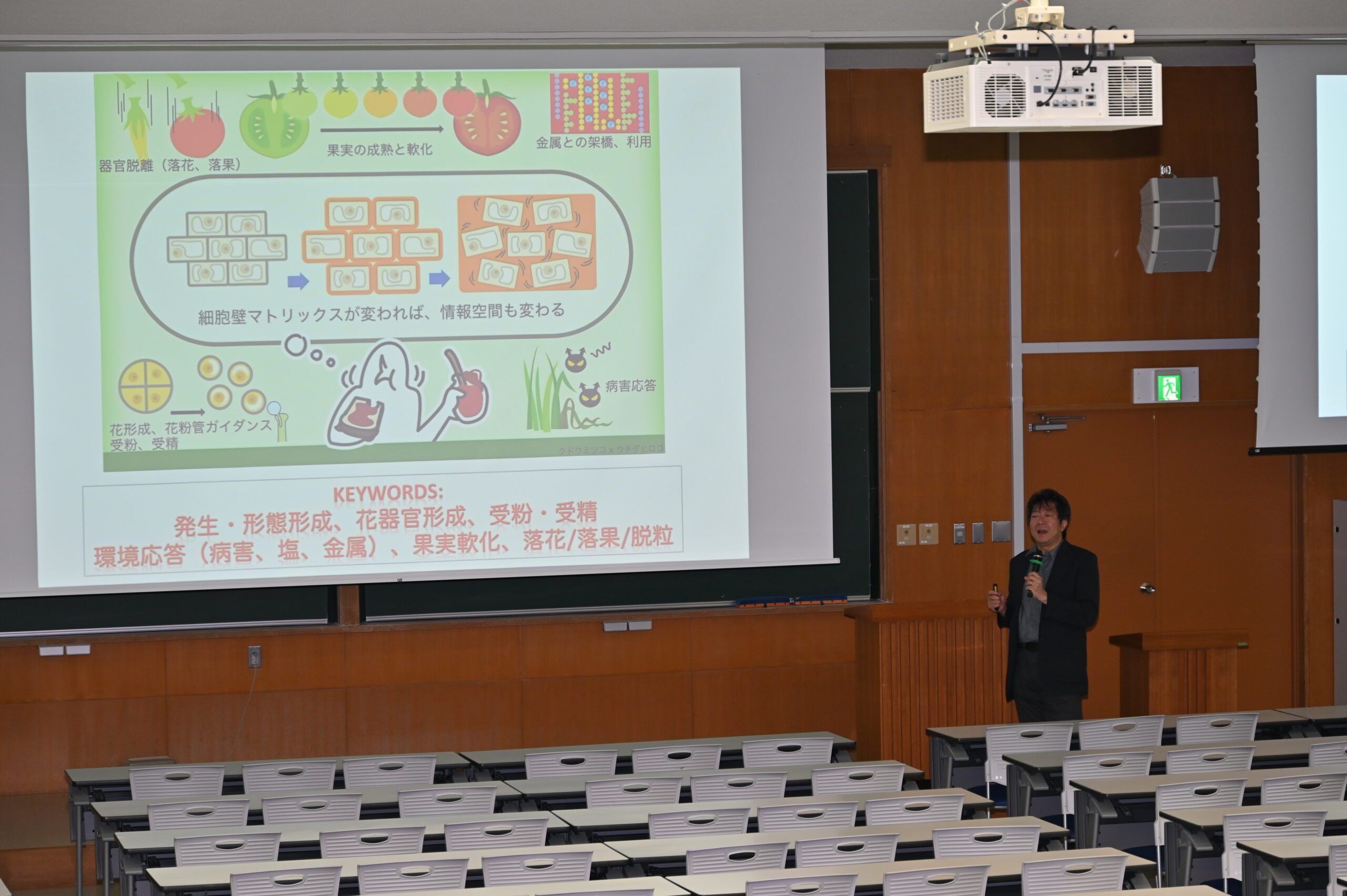 講師を務めたのは、今年4月に生物学部生物学科に着任した岩井宏暁教授です。筑波大学出身で日本学術振興会特別研究員の経歴を持つ植物生理学・園芸学が専門の岩井教授は、「植物細胞壁と金属の相互作用~力学的特性の変化~」をテーマに講演しました。岩井教授は、植物の成長や環境適応において細胞壁が果たす重要な役割を解説しました。細胞壁はセルロース、ヘミセルロース、ペクチンの3つの成分で構成されており、そのうちペクチンは細胞と細胞をつなぐ「接着剤」として働くだけでなく、カルシウムと結合して柔軟性を調整する機能を持つことを紹介しました。また、「花粉管の成長や分裂組織など、細胞間の接着と柔軟性が求められる部位でペクチンが特に重要な役割を果たしている」と説明し、アルミニウムが植物の成長に与える影響についても言及しました。さらに、アイソトープを用いたPETIS(Positron Emitting Tracer Imaging System)と呼ばれる手法により銅の移動を可視化し、ペクチンの生成を促す物質を与えることで、根における過剰な銅の蓄積が抑えられることも示しました。