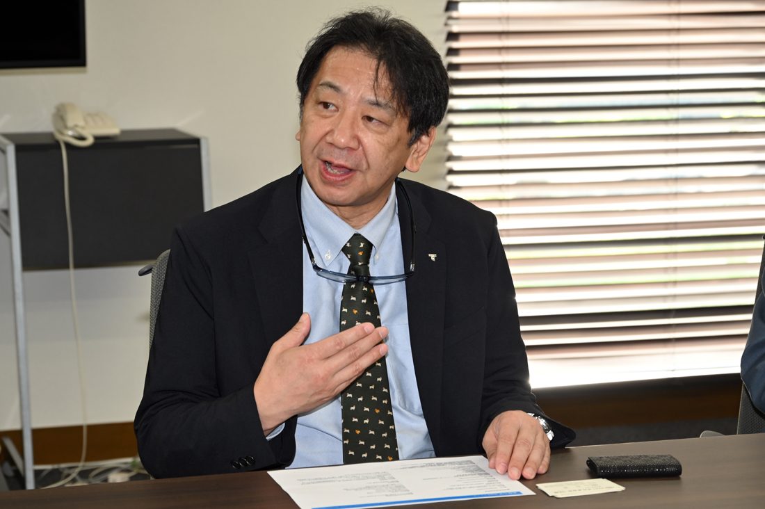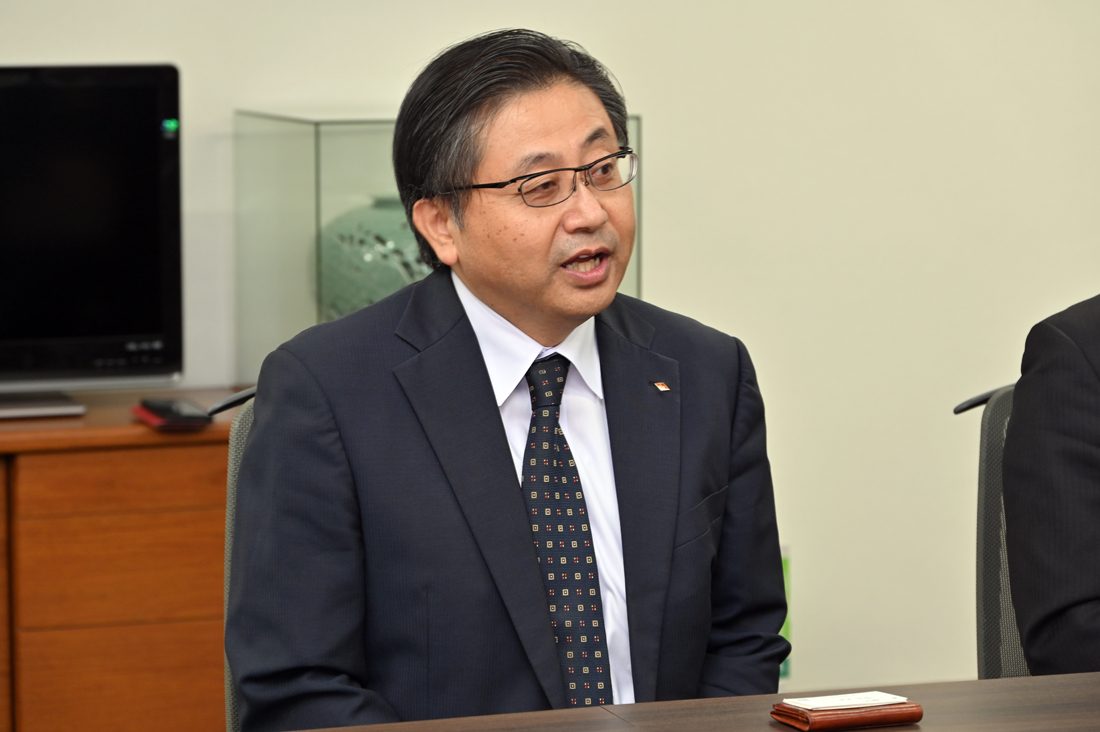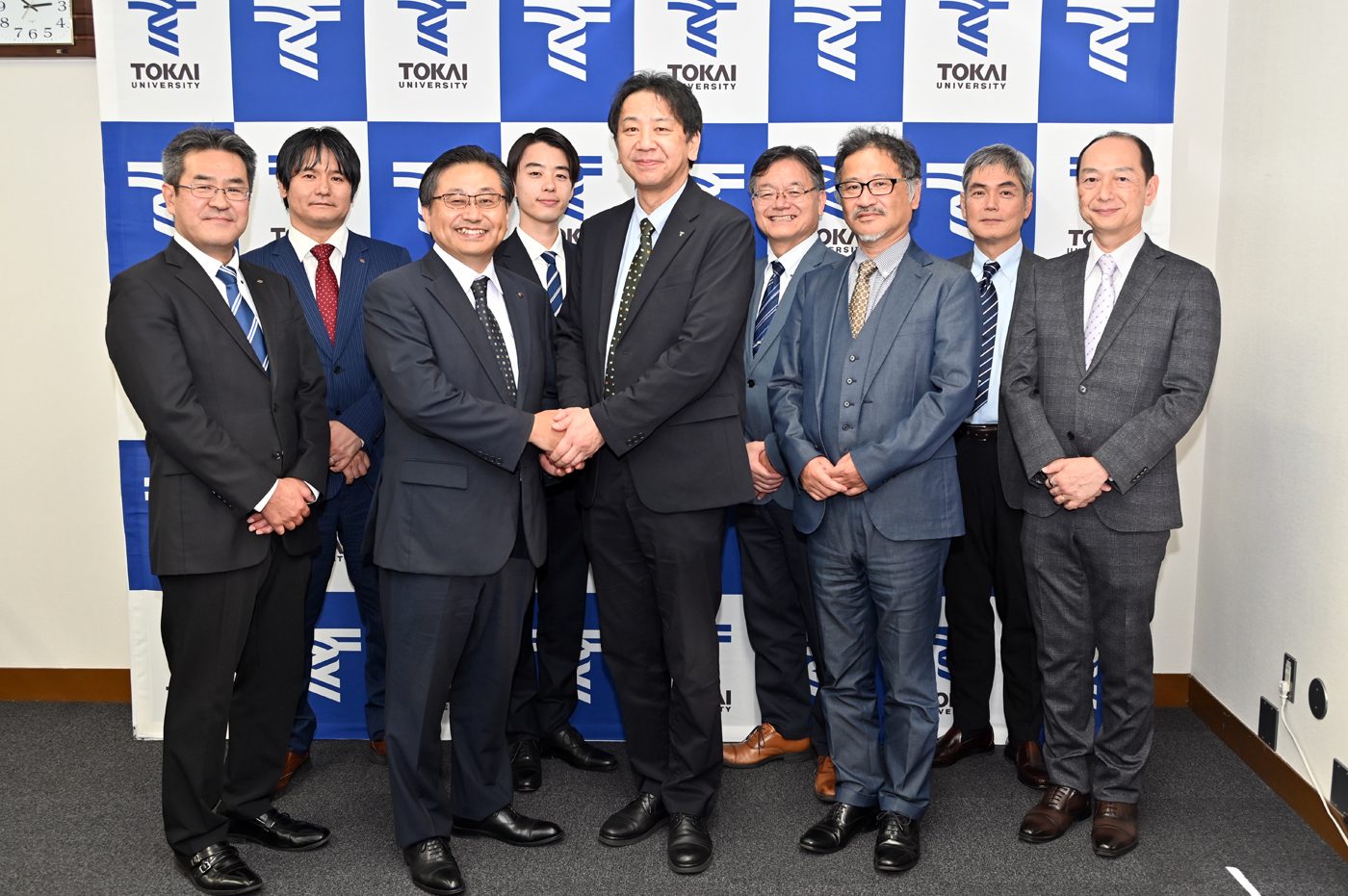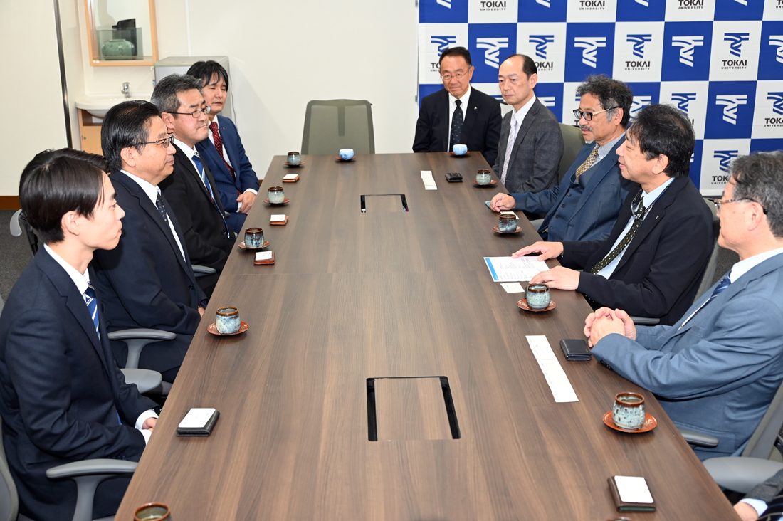 17日には名村造船所取締役兼常務執行役員、経営業務本部長の向周氏、設計本部技術開発センター長の山元康博氏ら一行が本キャンパスを訪問。本学の木村英樹学長、川﨑一平副学長(静岡キャンパス担当)らと懇談しました。席上、向氏から環境対応燃料への対応など造船業界の変化や設備投資計画が語られたほか、学生に造船業界の魅力を伝えるための工場見学会開催などについて紹介がありました、木村学長は造船業界における人材不足と理系人材育成の課題について語り、「造船業だけでなく、航空整備士やトラック・バス運転手など多くの産業で人材が不足しています。入試方式の改革なども図り理工系人材の育成を進めていきますが、今回のような産学連携の強化も通じて理工系のすそ野を広げていきたい」と期待を語りました。