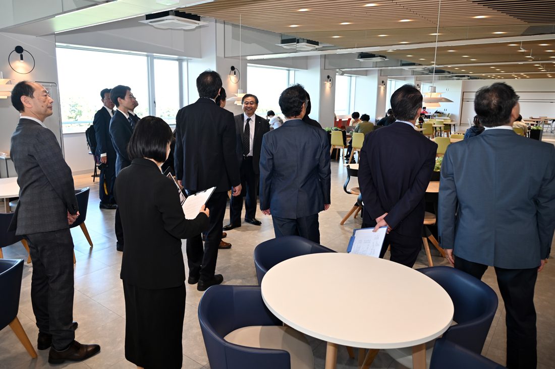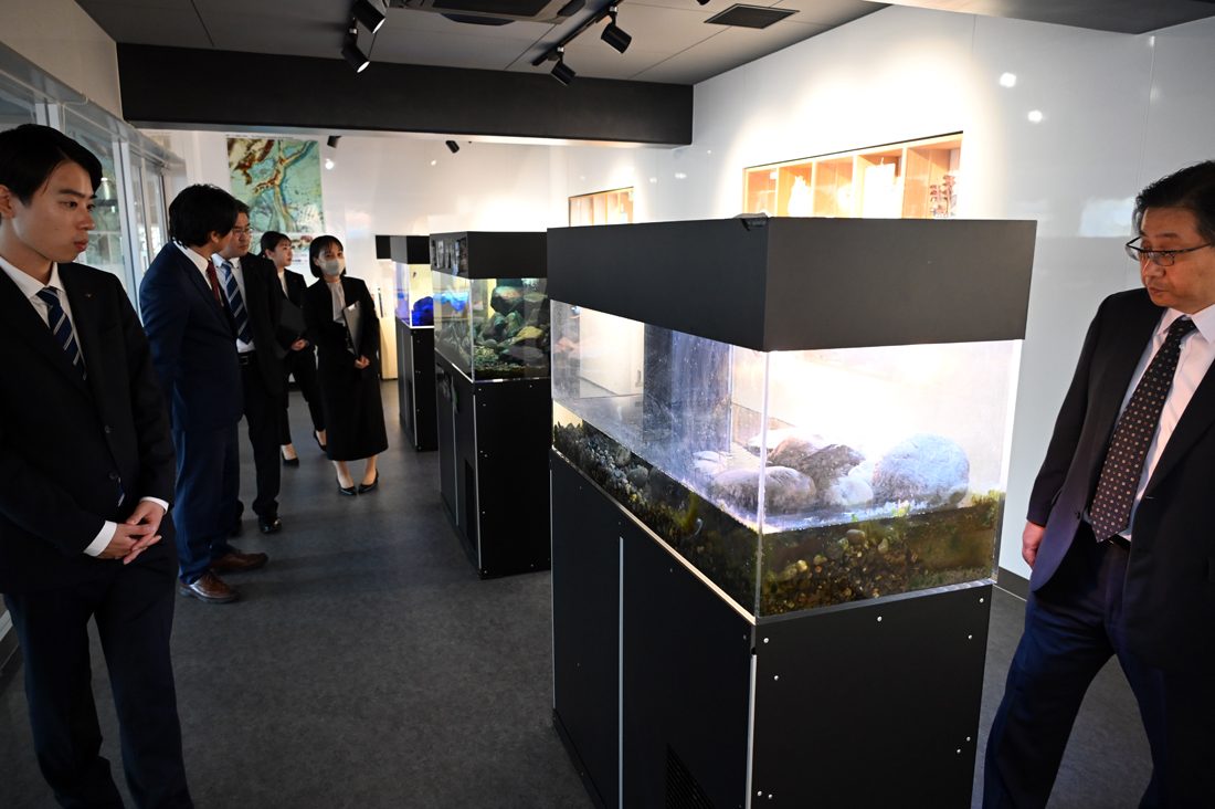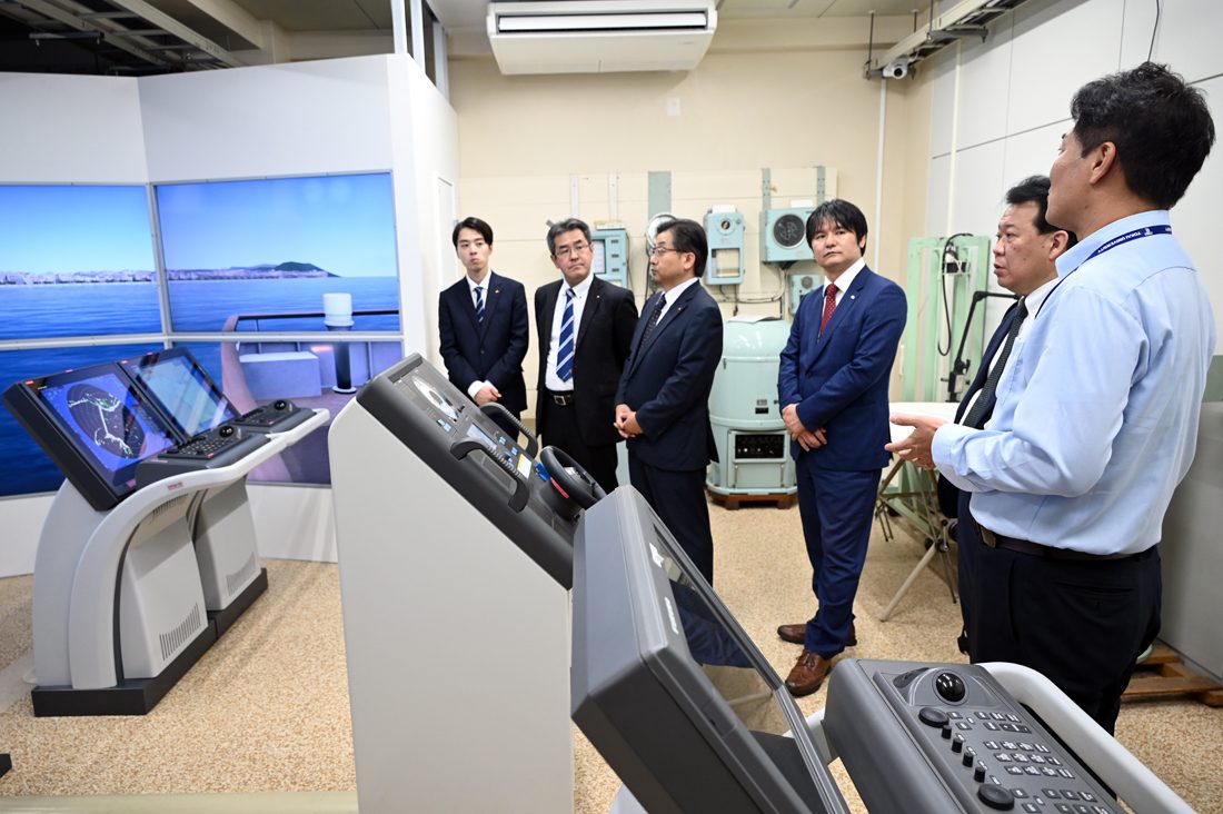 その後、向氏ら一行は本キャンパス職員の案内でキャンパス内を見学。交流スペース「PLAT(ぷらっと)」をはじめ、教室や図書館、学生食堂、操船シミュレーター、海洋学部の研究成果や学生の課外活動を紹介する展示室「TOKATEN」を巡りました。