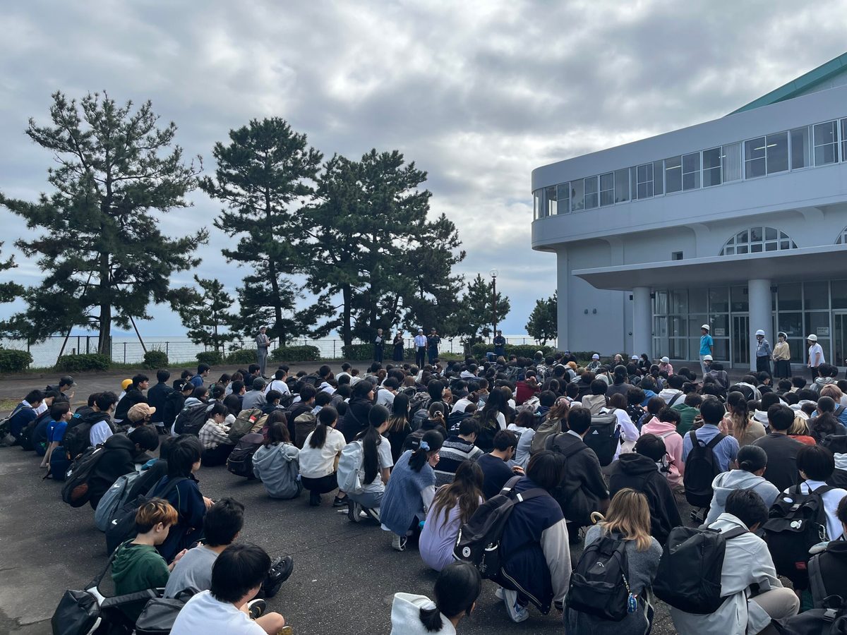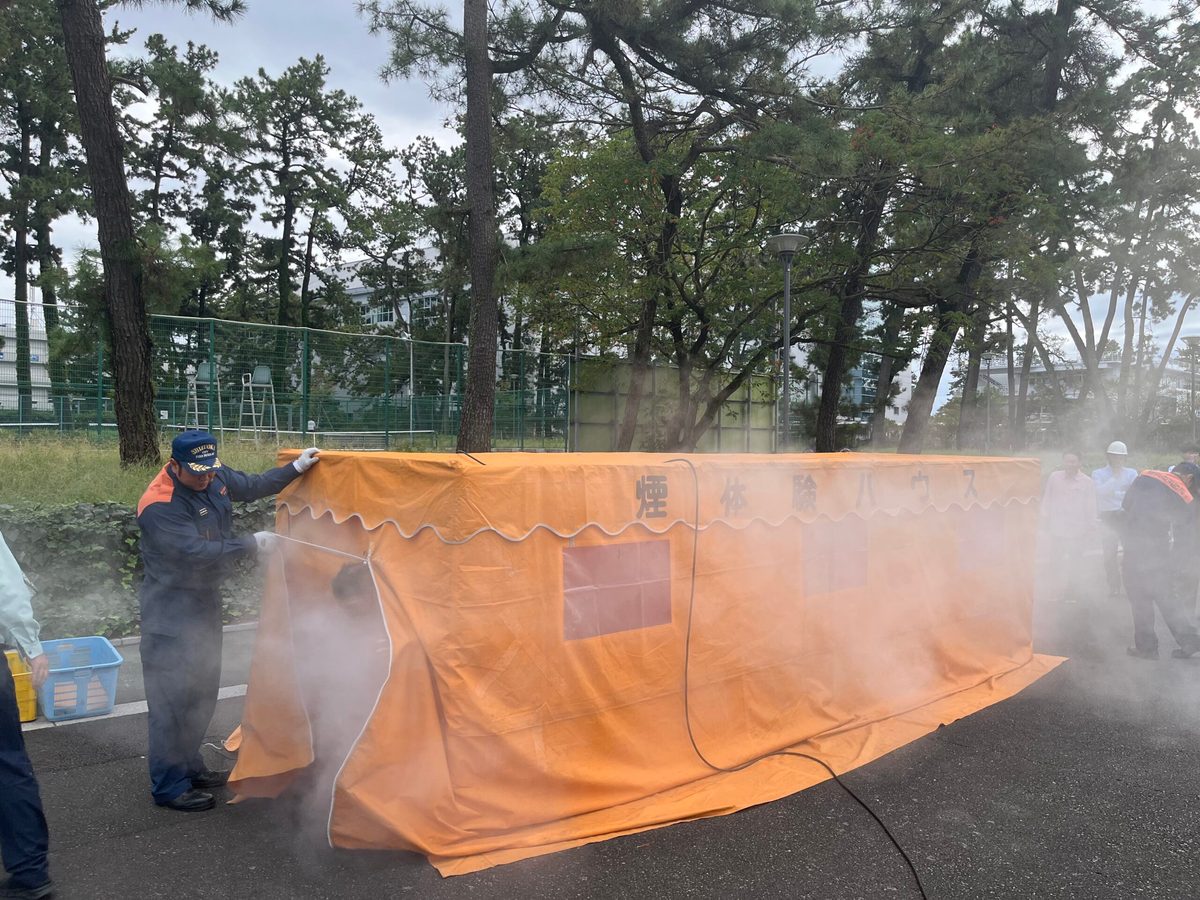 今年は10月15日(水)に「大規模火災発生時を想定した避難訓練」を実施し、学生433名、教職員他85名の計518名が参加しました。訓練は12時10分に開始され、キャンパス内2か所からの出火を想定し、緊急放送に従って学生や教職員が各教室から1号館前および体育館前に避難しました。 また、今年は追加訓練として、日本平消防署の協力のもと「スモークハウス体験」を実施しました。煙が充満した空間を模擬体験することで、視界の悪さや呼吸のしづらさを実感し、火災時の避難行動の重要性を学ぶ貴重な機会となりました。