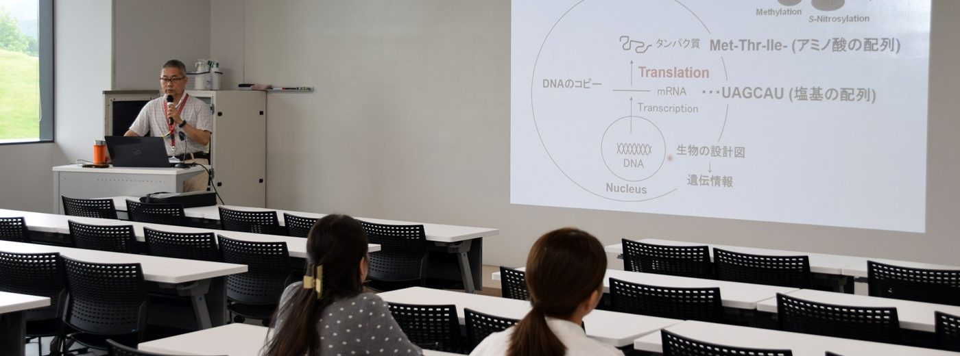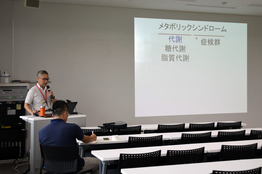 総合農学研究所では7月14日に阿蘇くまもと臨空キャンパスで、「ランチョンセミナー第2回」を開催しました。教員の研究内容や最新の研究話題を共有しようと月に1回程度開いているもので、今回は本研究所の永井竜児教授(農学部食生命科学科)が「世の中わかっていないことだらけ~ミトコンドリアの機能異常が誘導する新たな老化機構の発見~」をテーマに講演。学生や教職員約20名が参加しました。