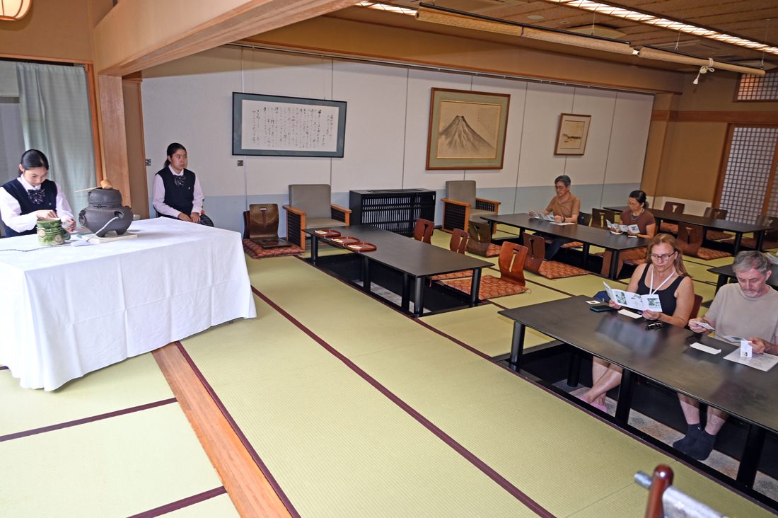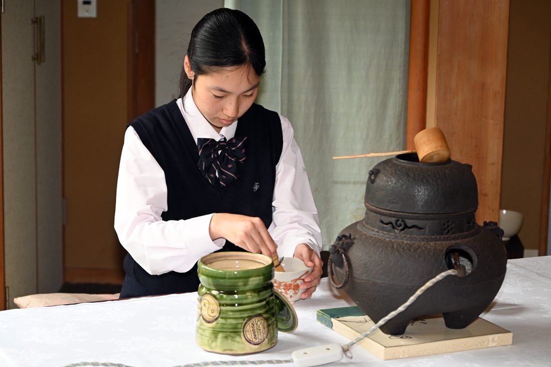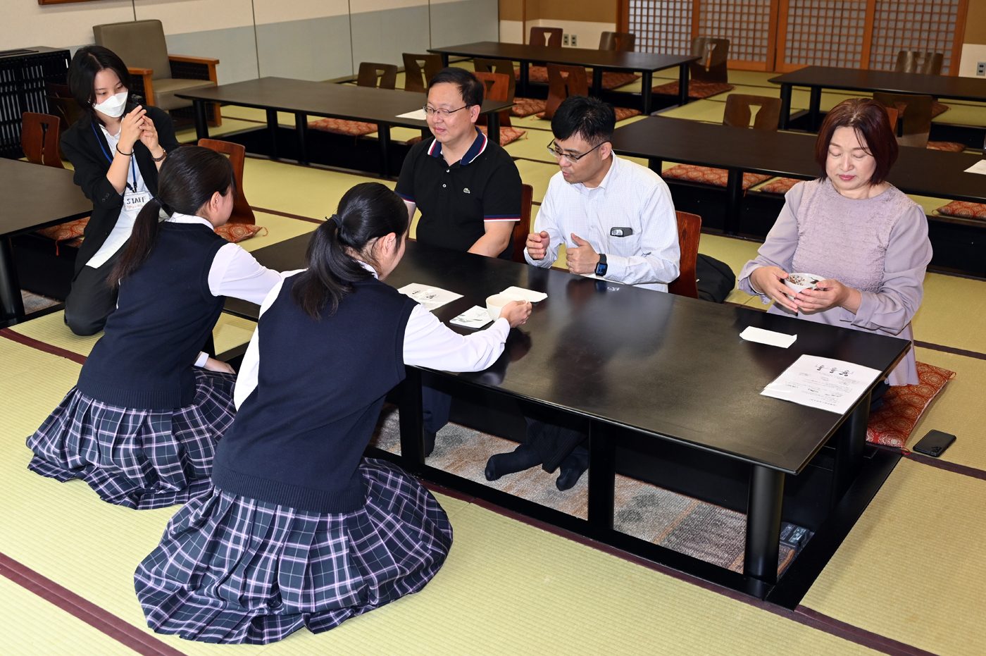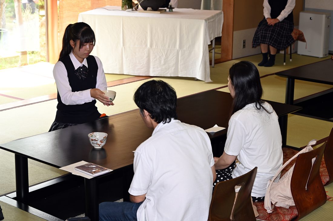 当日は、羽衣ホテルの面する富士山世界文化遺産の構成資産である三保松原で、学生と生徒が手分けして参加を呼びかけ、希望者をホテルの中庭と大広間に案内。偶然通りかかった海洋学部の卒業生も来場する中、ブラジルや中国、イギリス、ギリシャなどから来日中の観光客に向けて茶道部のメンバー5名が抹茶をたてて振る舞い、大学生と教員らが菓子や広間のしつらえなどについて英語で説明しました。参加者は静かな雰囲気の中でお茶を楽しみ、日本文化の奥深さに触れていました。生徒たちを指導する茶道部部長教員の牧野奈央教諭(静岡翔洋高教頭)は、「学校外のイベントでお茶をたてる機会は少なく、生徒たちは緊張しながらもしっかりと日ごろの稽古の成果を見せてくれました」と語りました。