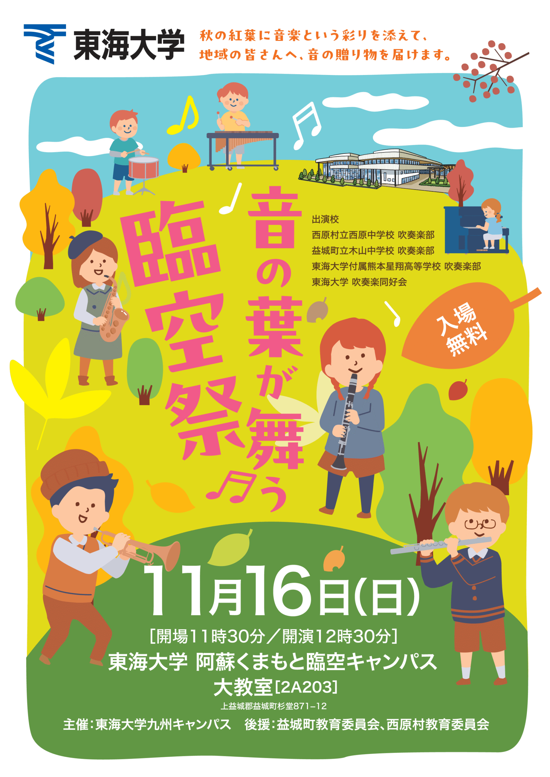 阿蘇くまもと臨空キャンパスで、吹奏楽の演奏会「音の葉が舞う臨空祭」を開催いたします。