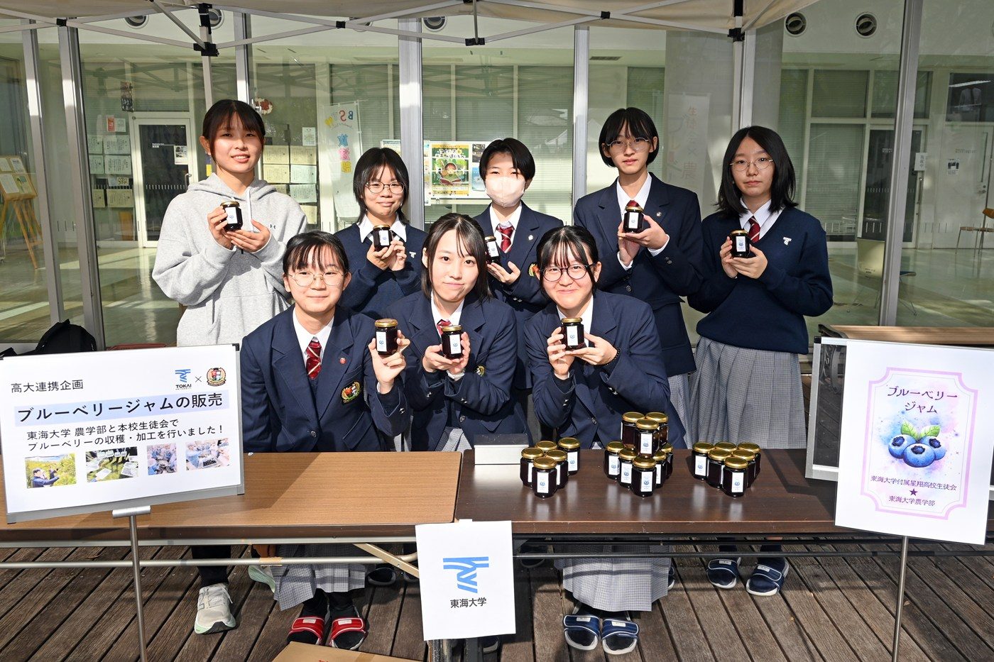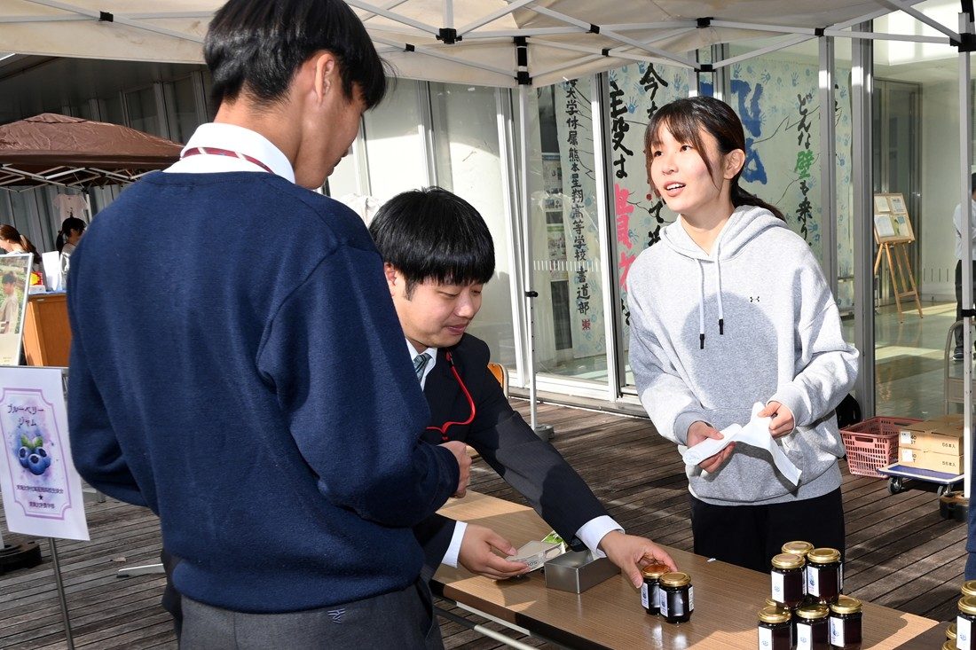 農学部では11月4日に付属熊本星翔高校で開催された建学祭「星翔祭」で、ブルーベリージャムの販売会を実施しました。同高生徒会顧問の髙﨑修一郎教諭から「生徒たちが将来を考えるうえでさまざまな選択肢を持てるように、農学部の魅力を伝えたい」と星良和学部長に相談があり、農学科の佐伯爽講師と研究室の学生が協力したものです。